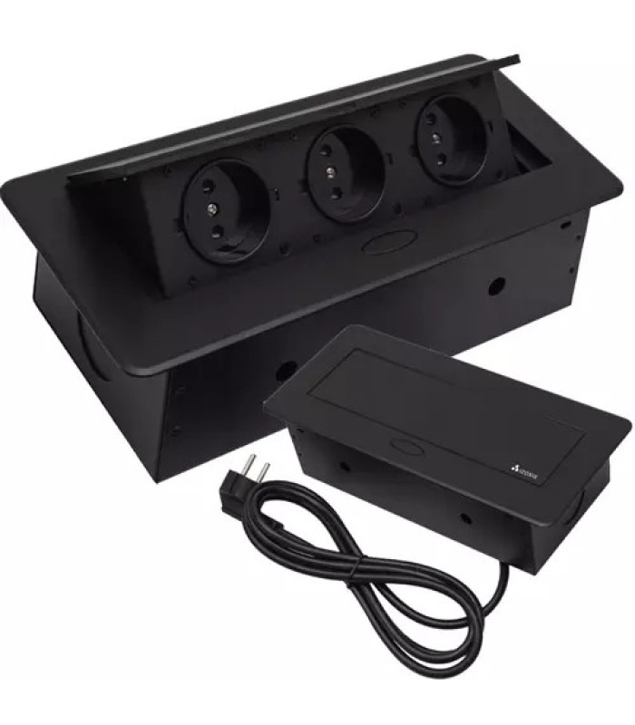 - Specifikācija - Barošana: 230VAC/50Hz EU; barošanas kabelis: 3x1,5mm2 mīksts kabelis; rozetes skaits: 3; rozetes tips: 3P+Z; maksimālā slodze: 3300W; Schuko tipa iezemējums; kabeļa garums: 1,9m; krāsa: melna; izmēri: 26,5 x 12 x 7 cm; montāžas atveres izmēri: 22 x 10,8 x 6,5 cm (plat./augst./dz.); svars: 1,608 kg; iepakojuma svars: 1,764 kg.