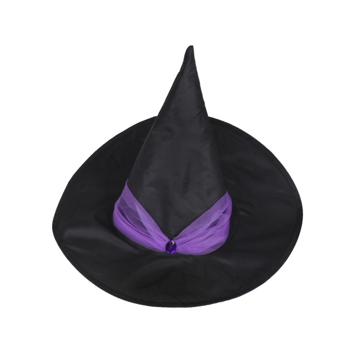 - Melna smailā Cepure ar dekoratīvu purpura tillu un dārgakmeni.
