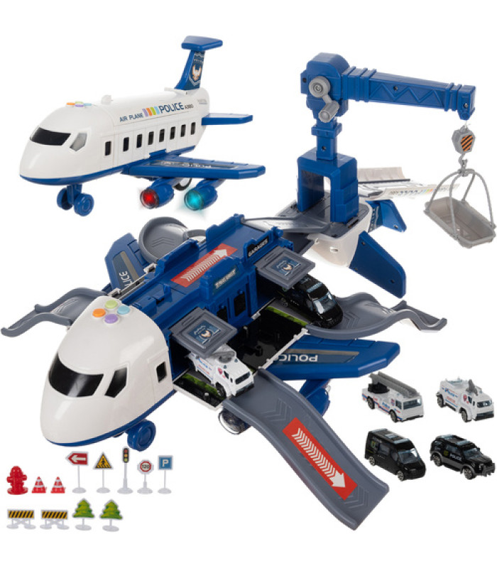 Policijas lidmašīna ar kustīgām detaļām - komplektā ietilpst liela lidmašīna ar atveramām durvīm, rampu, auto izmetēju un grozāmu celtni, kas piešķir spēlei reālismu un dažādību jebkuram piedzīvojuma scenārijam.