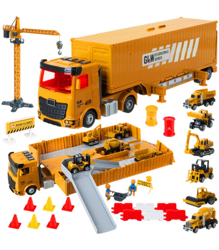 Pristatome unikalų rinkinį, kuris greitai transformuojasi į tikrą statybvietę! Stabilus, mobilus kranas su metaliniu atsvaru transportuoja medžiagas tiksliai ten, kur jų reikia. Rinkinį sudaro didelis sunkvežimis su ištraukiama platforma, betono maišyklė, volas, šakinis krautuvas, vikšrinis ekskavatorius, krautuvas, savivartis ir priedai, tokie kaip kūgiai, statinės ir įspėjamieji barjerai. Šis žaislas garantuoja valandas kūrybiško ir saugaus žaidimo – puikiai tinka mažiesiems statybinės technikos gerbėjams!
