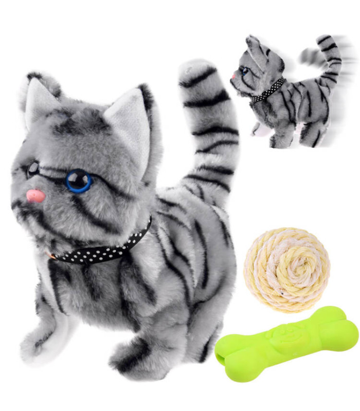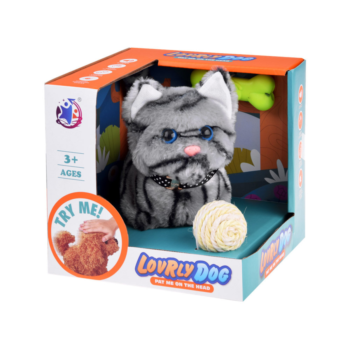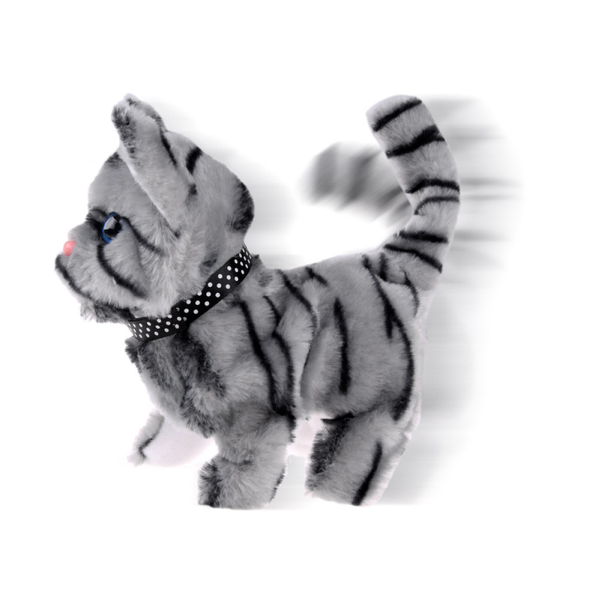 Pelēks interaktīvs kaķēns, kas aizraus jebkuru bērnu un kļūs par labāko pūkainu draugu. Šis kaķēns ar mīkstu pelēku kažokādu melnās svītrās, rozā deguntiņu, zilām acīm un melnu apkakli ar baltu punktiņu un zelta rotājumu, darbojas ar baterijām. Pēc to uzstādīšanas kaķēns sāk murrāt, staigāt uz priekšu un atpakaļ, kustina galvu, purniņu un asti. Papildus nāk ar mīkstu, gumijotu, zaļu kubu un krāsainu bumbiņu, kas aptīta ar auklu.