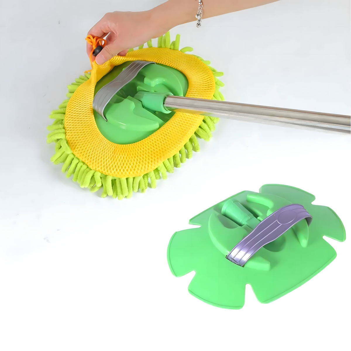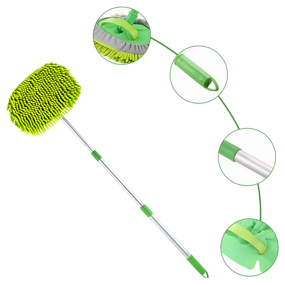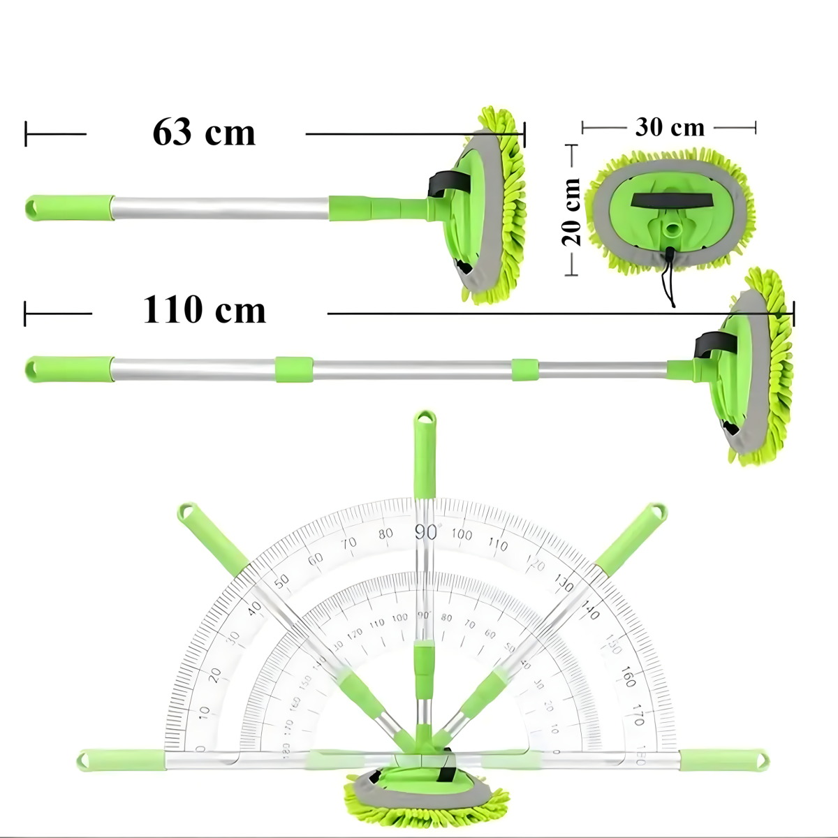 Viegls un izturīgs rīks ar šenila mikrošķiedru, kas neskrāpē virsmas. Regulējams rokturis līdz 1,1 m, 180° rotējoša galva, neslīdošs rokturis un iespēja izmantot kā cimdu. Ideāli piemērots automašīnai, mājai un dārzam!