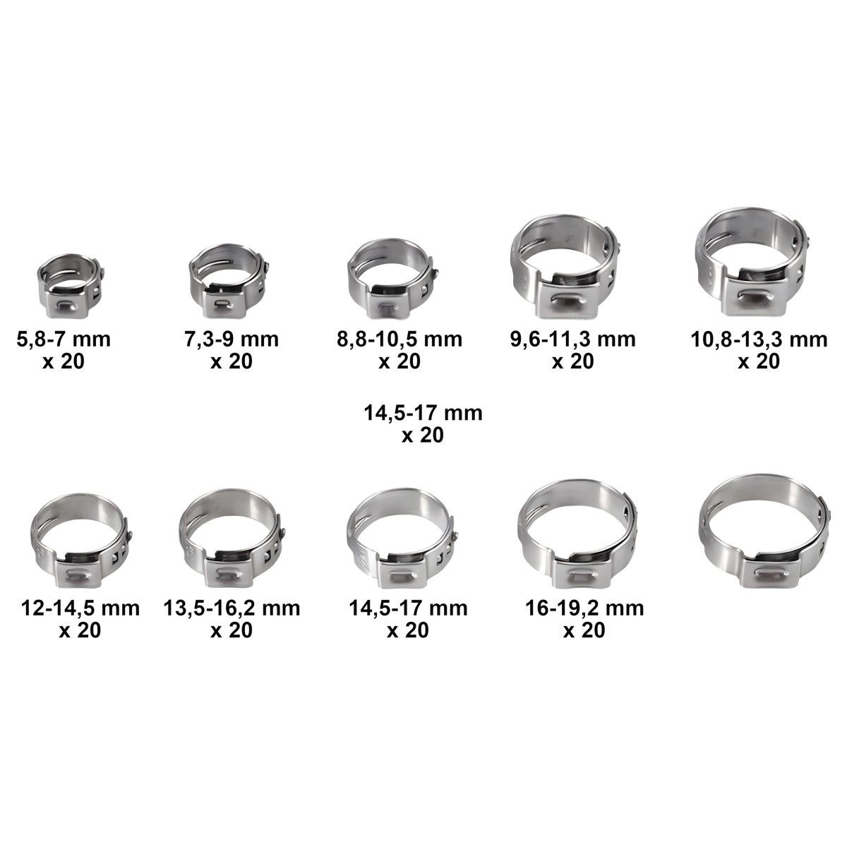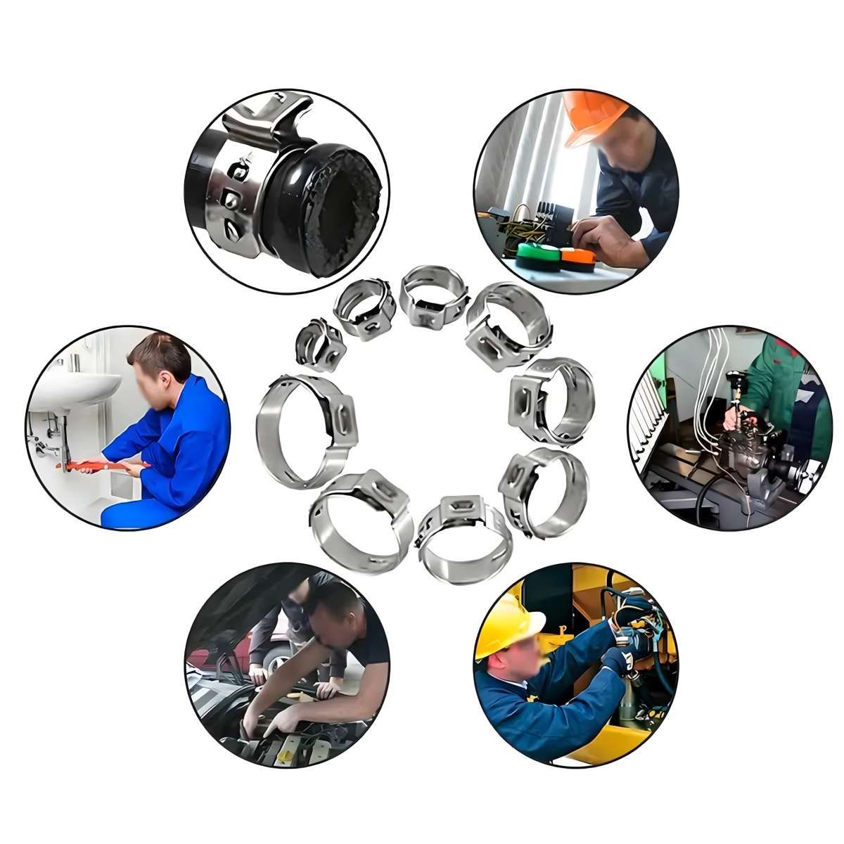 Izgatavots no augstas kvalitātes materiāliem, komplekts nodrošina izturību un uzticamību, ļaujot ātri un precīzi piestiprināt skavas uz vadiem, šļūtenēm un caurulēm ar diametru no 5,8 līdz 21 mm. Ideāli piemērots izmantošanai automobiļu rūpniecībā, santehnikā, sadzīves tehnikas apkopē un daudzās citās nozarēs.