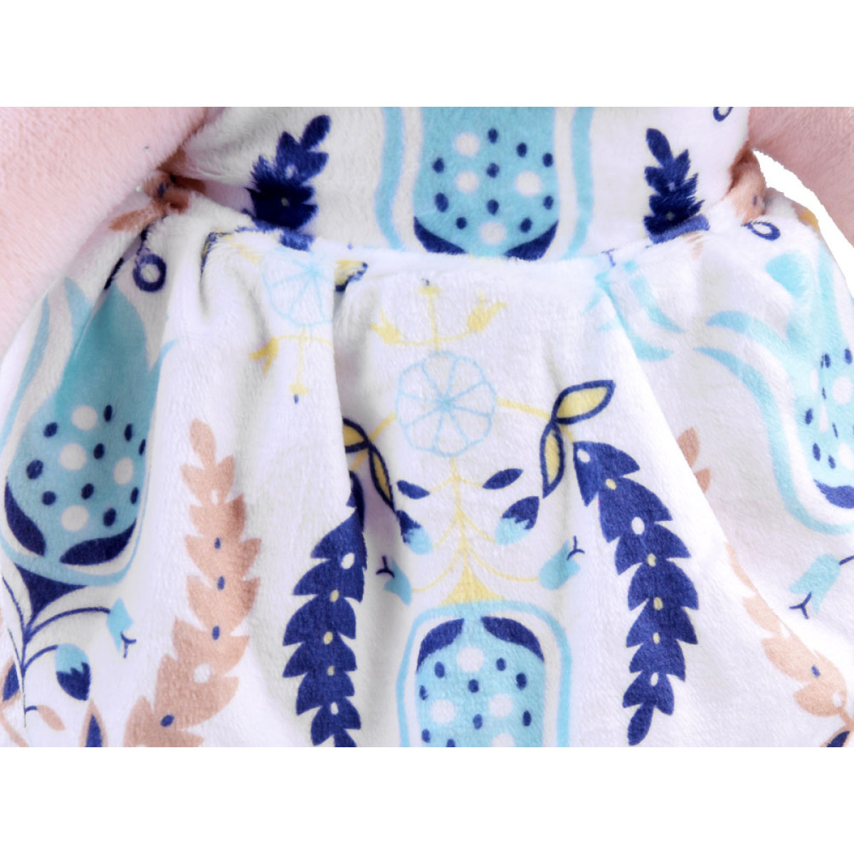 Lellīte ir pilnībā izgatavota no mīksta, patīkama uz tausti materiāla. Samta kleitiņa ar augu motīvu ir krāsu saskaņota ar apaviem, apkakli un cepuri. Lelles mati ir cirtaini un blondi.