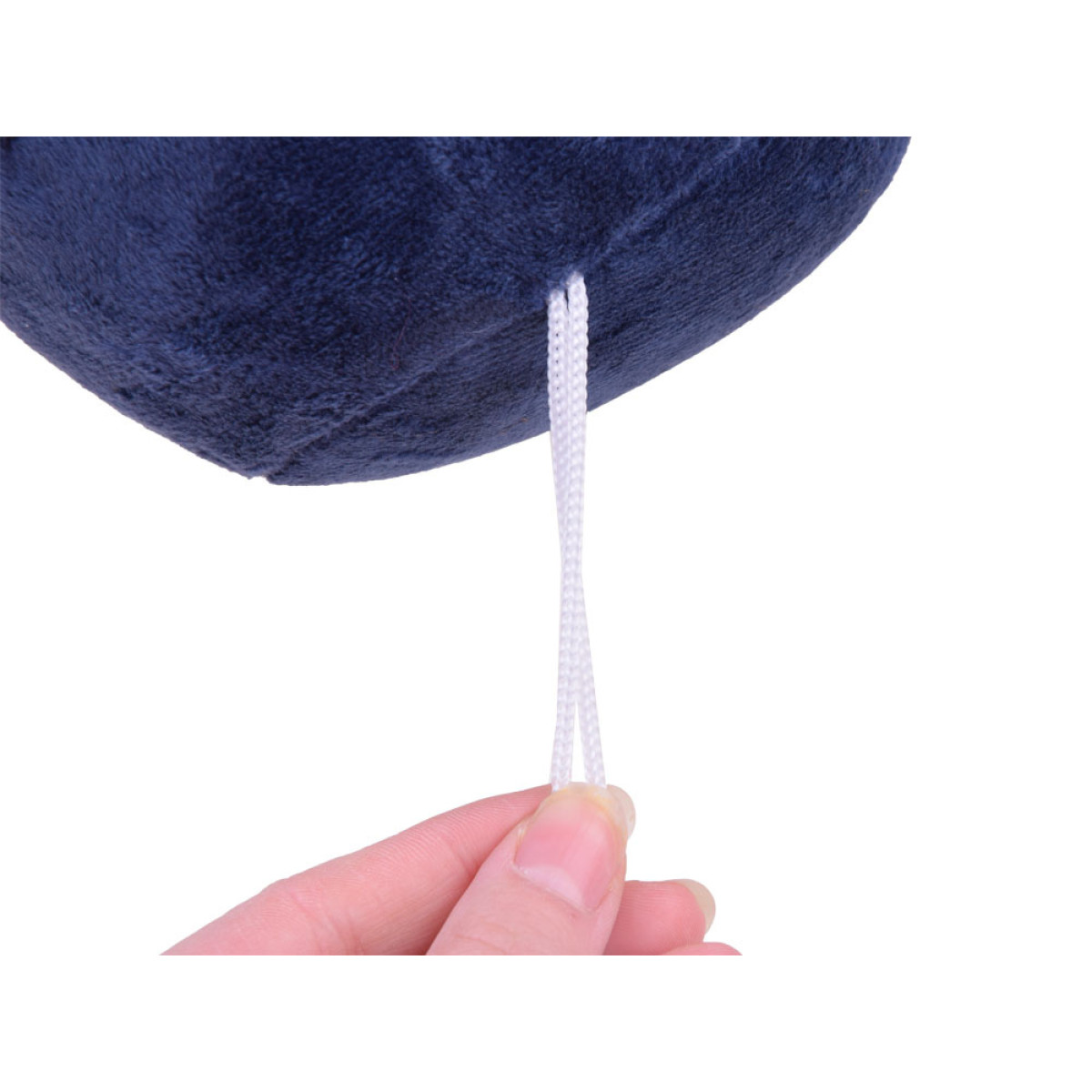 Uz viņas galvas ir aukla, kas ļauj lelli pakārt jebkurā vietā: ratiņos, gultiņā vai pie sienas.