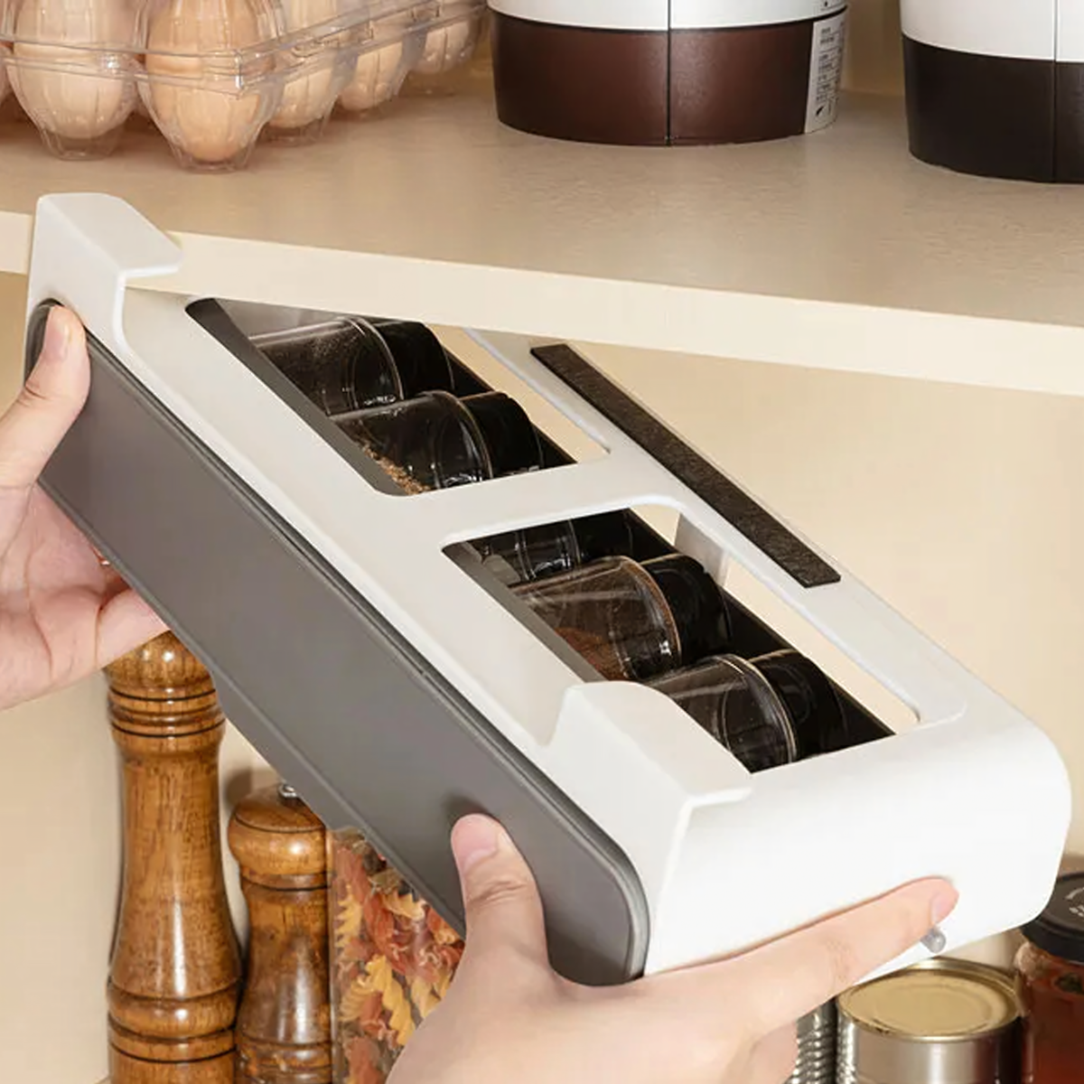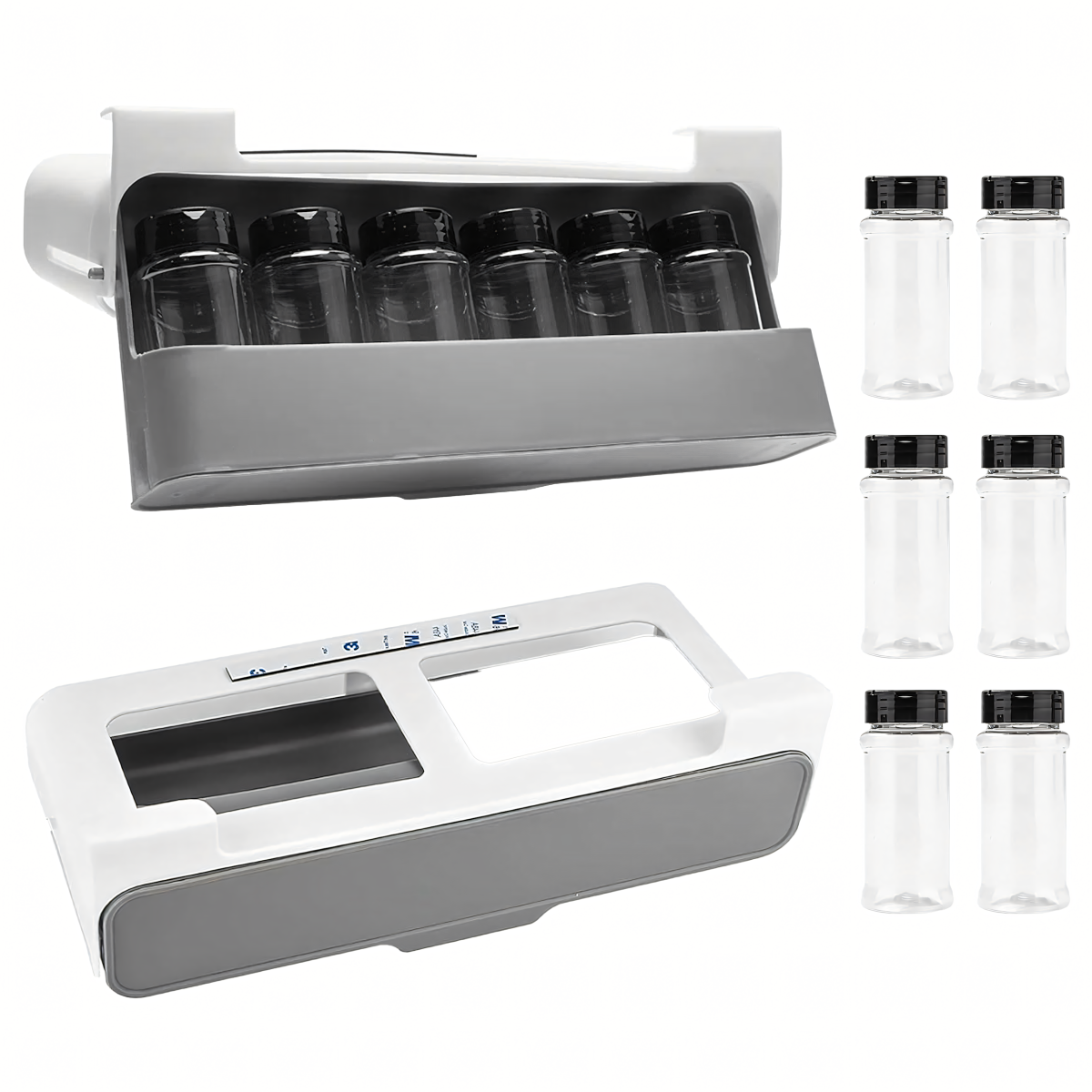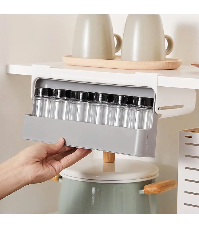 Praktisks virtuves organizators ar 6 caurspīdīgām burciņām, montējams bez urbšanas, pateicoties 3M līmlentei. Taupa vietu, nodrošina ātru piekļuvi garšvielām un der vairumam skapju. Ideāli piemērots jebkurai virtuvei!