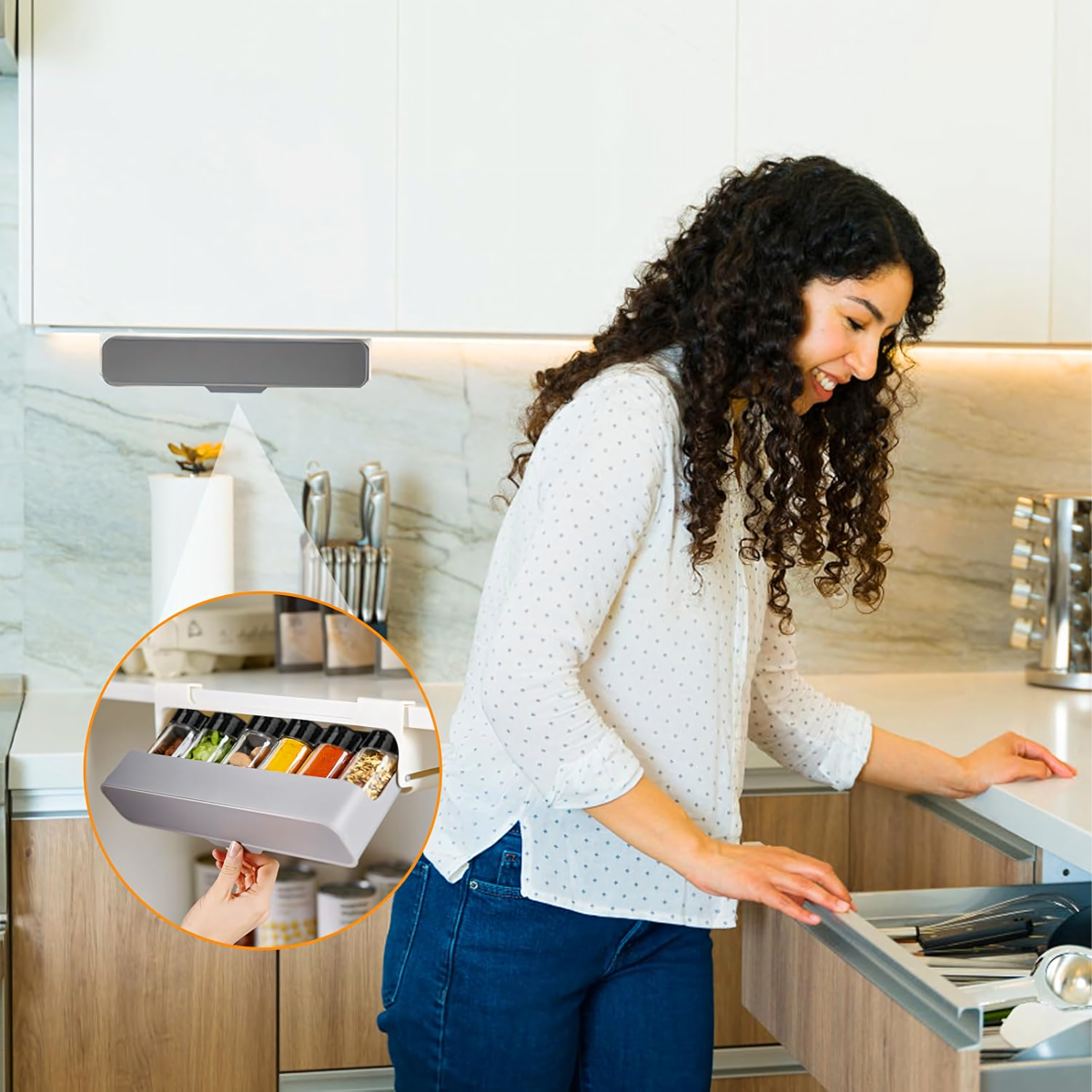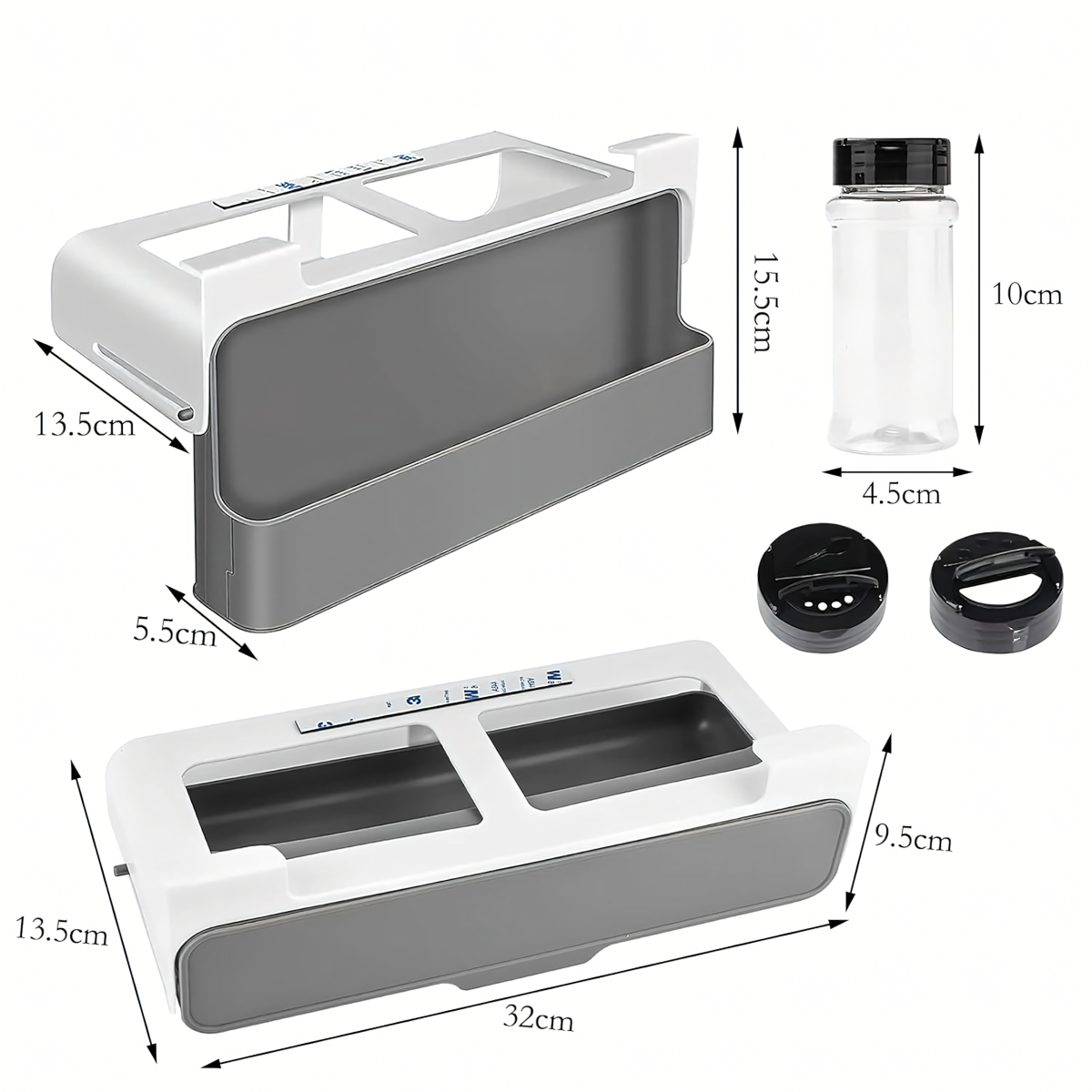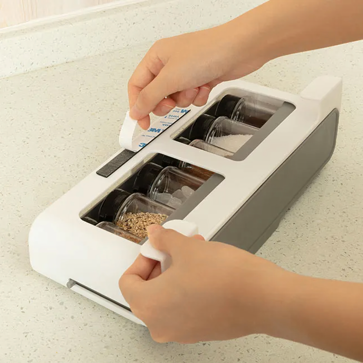 Praktisks virtuves organizators ar 6 caurspīdīgām burciņām, montējams bez urbšanas, pateicoties 3M līmlentei. Taupa vietu, nodrošina ātru piekļuvi garšvielām un der vairumam skapju. Ideāli piemērots jebkurai virtuvei!
