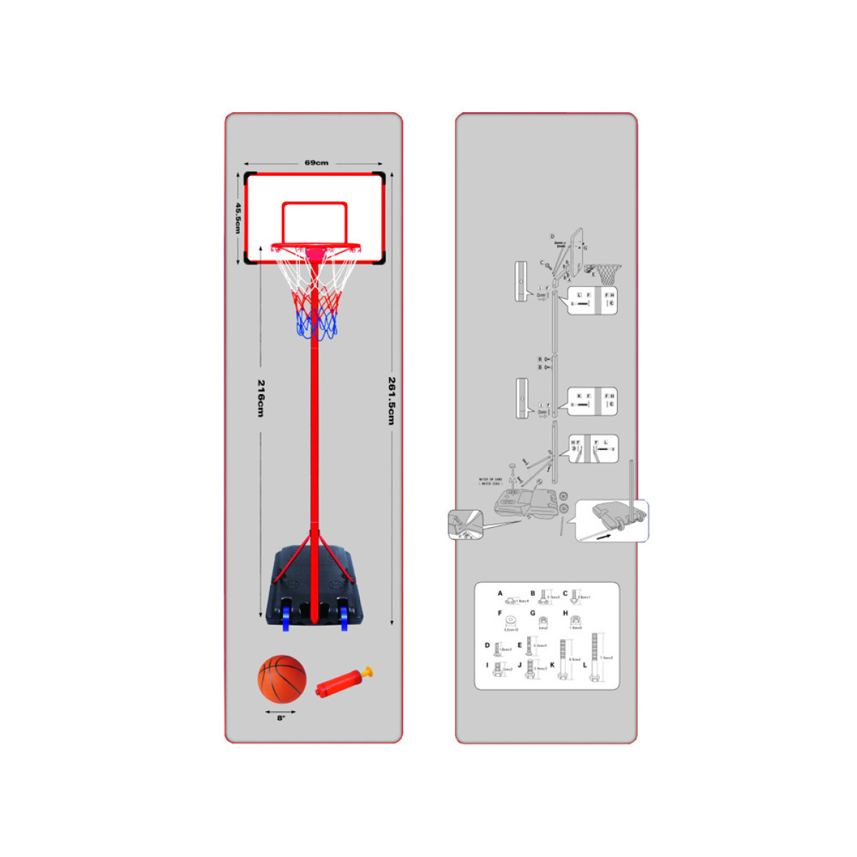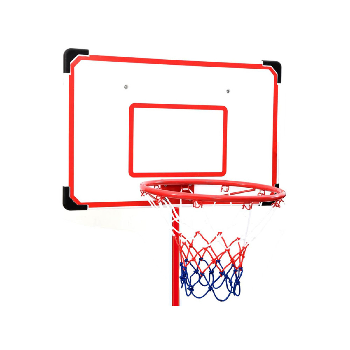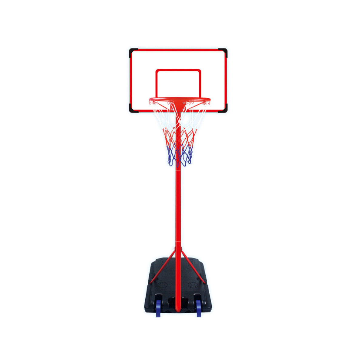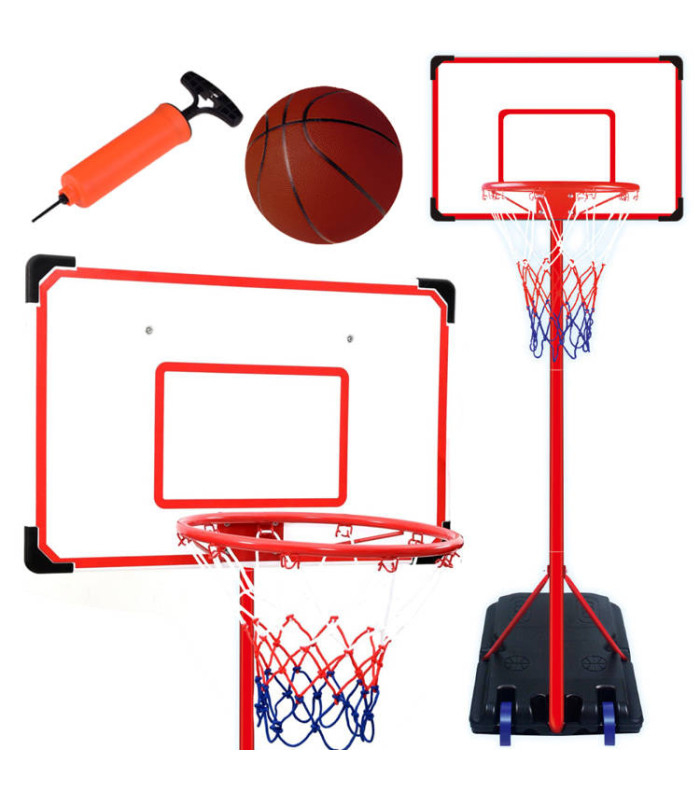 Praktisks stends ar dēli basketbola spēlei, komplektā ar bumbu un pumpi, garantē lielisku izklaidi svaigā gaisā. Viss komplekts lieliski piemērots skolas laukumam, dārzam vai rotaļu laukumam. Stipra bāze ar riteņiem un stabs, kas ir nostiprināts pamatnē, padara basketbola spēli par īstu prieku visiem basketbola faniem. Pateicoties riteņiem pie pamatnes, visu komplektu var viegli pārvietot.Viegla un ātra montāža un regulējams groza augstums nodrošina pilnīgu lietošanas komfortu.