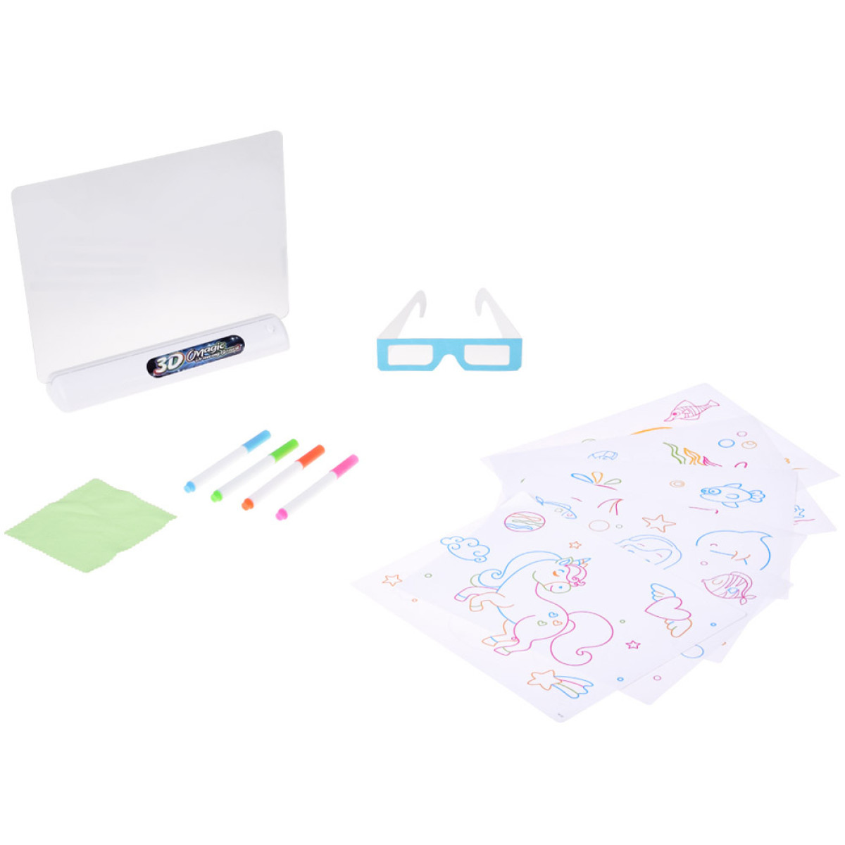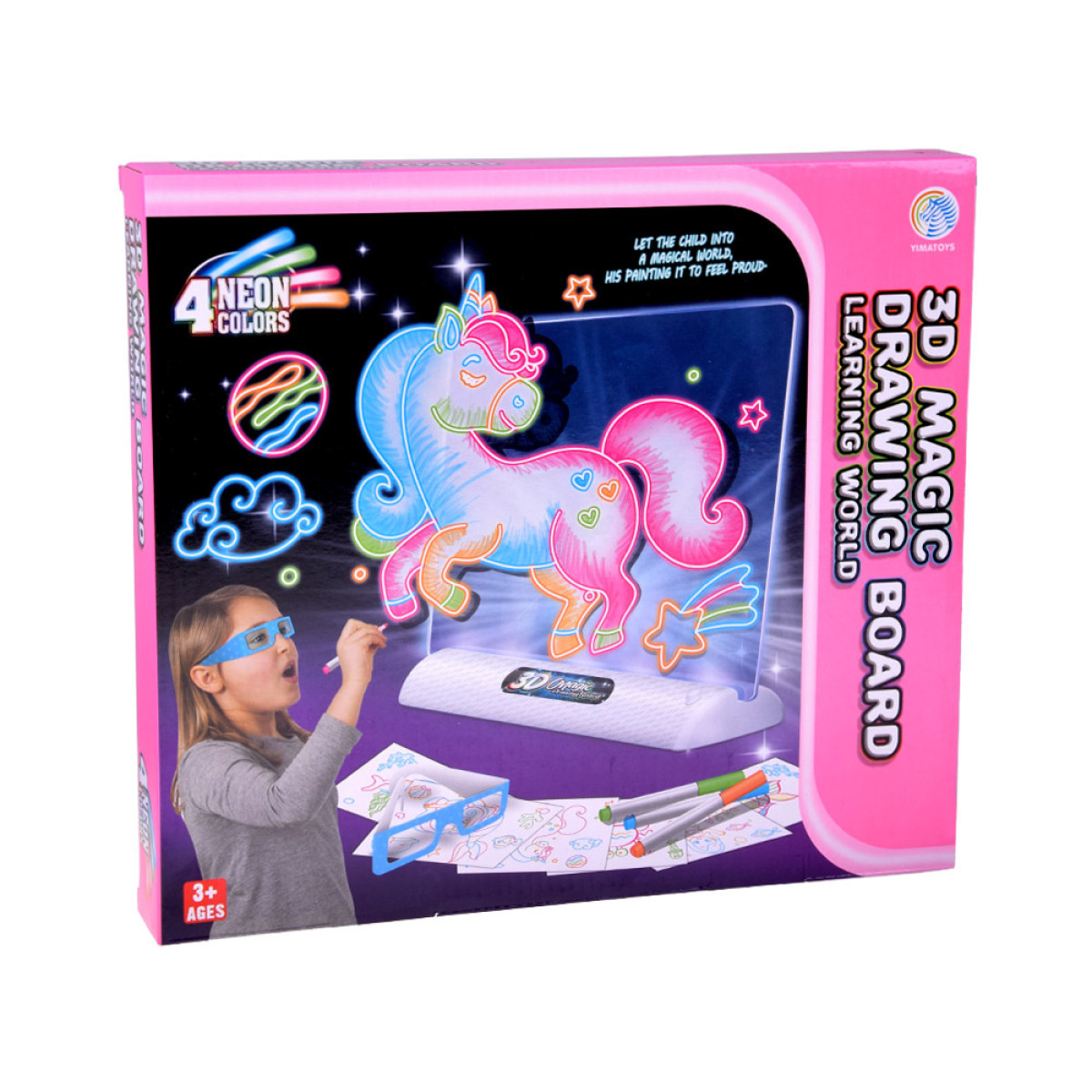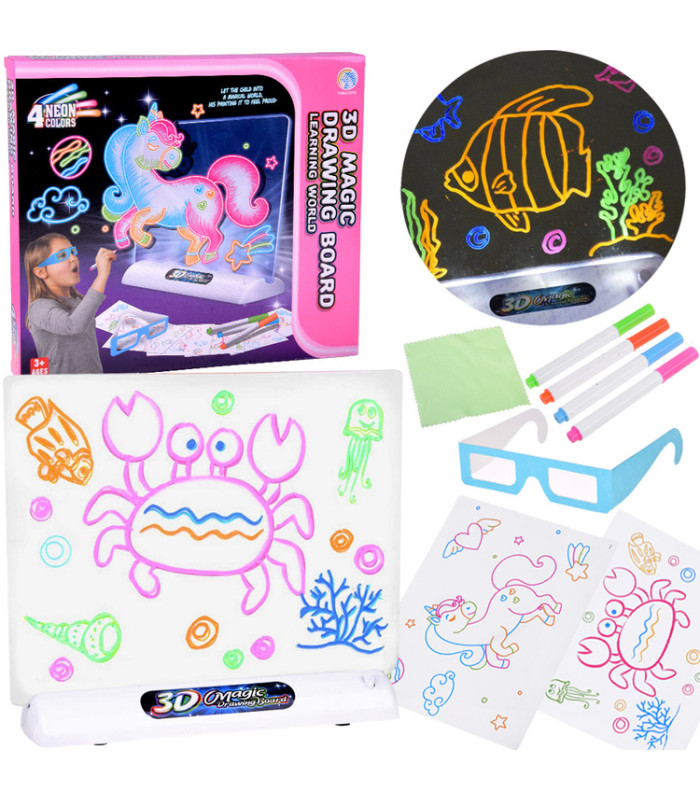 Atveriet sava bērna priekšā durvis uz maģisko zīmēšanas pasauli! 3D zīmēšanas dēlis ir neparasts rīks, kas ļauj radīt spīdošus attēlus ar 3D efektu. Pateicoties fluorescējošām pildspalvām, LED apgaismojumam un īpašām 3D brillēm, katrs darbs kļūst par unikālu mākslas darbu.