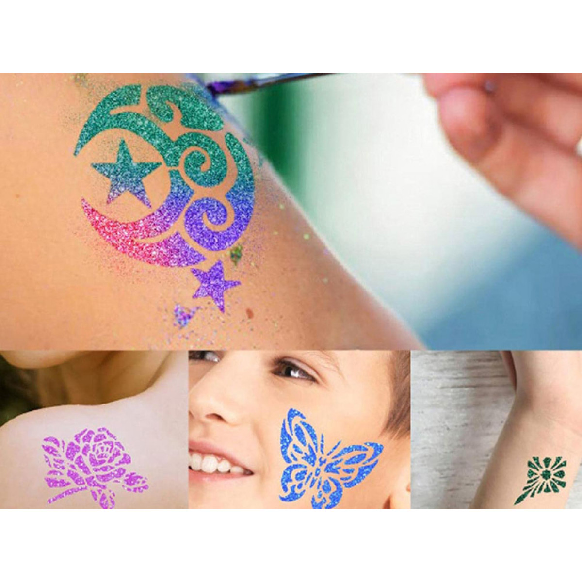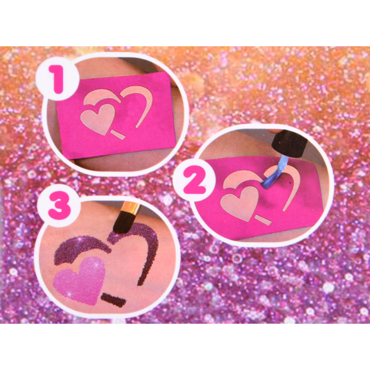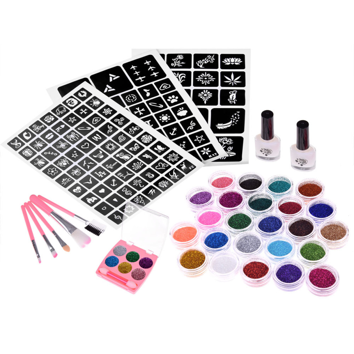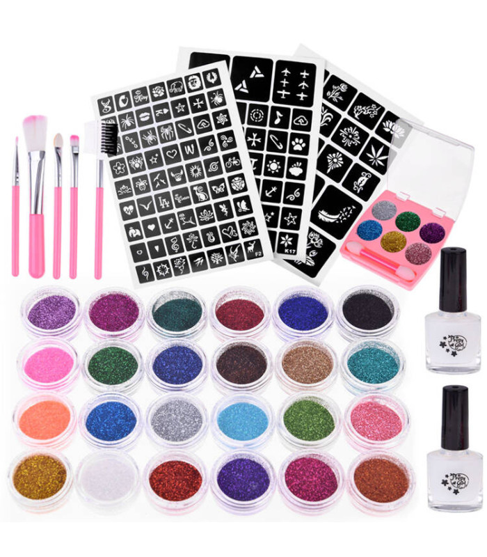Glitter tetovējumi ir katras vasaras hits. Šis lieliskais komplekts palīdzēs izveidot modernus glitter tetovējumus. Komplektā ietilpst 120 dažāda izmēra šabloni, 24 burkas ar skaisti mirdzošiem glitter pulveriem un 2 pudeles līmes, kas pietiks vairākām tetovējumiem. Pievienotie glitter acu ēnas un otas komplekts palīdzēs izveidot fantastisku stilu. Glitter tetovējumi ir viegli mazgājami un, kas ir vissvarīgākais, droši bērnu maigai ādai.