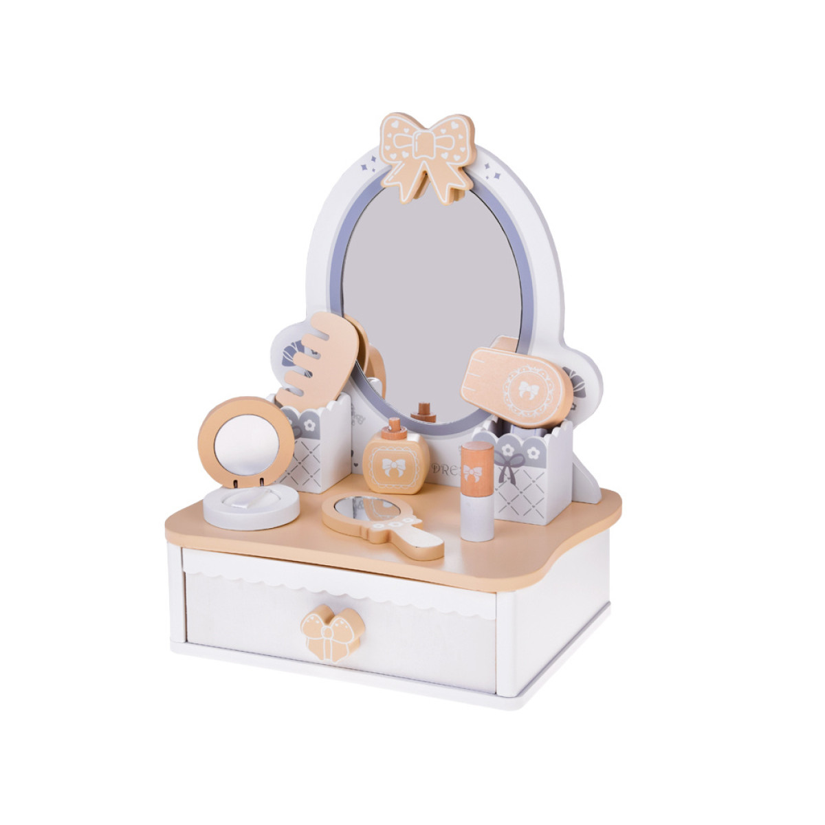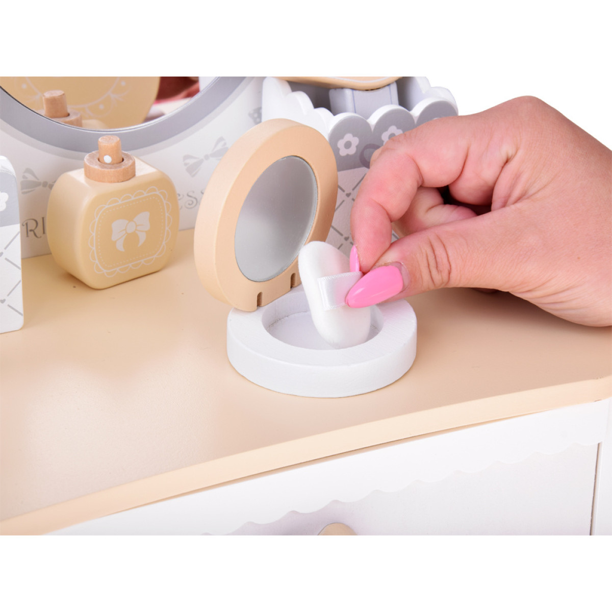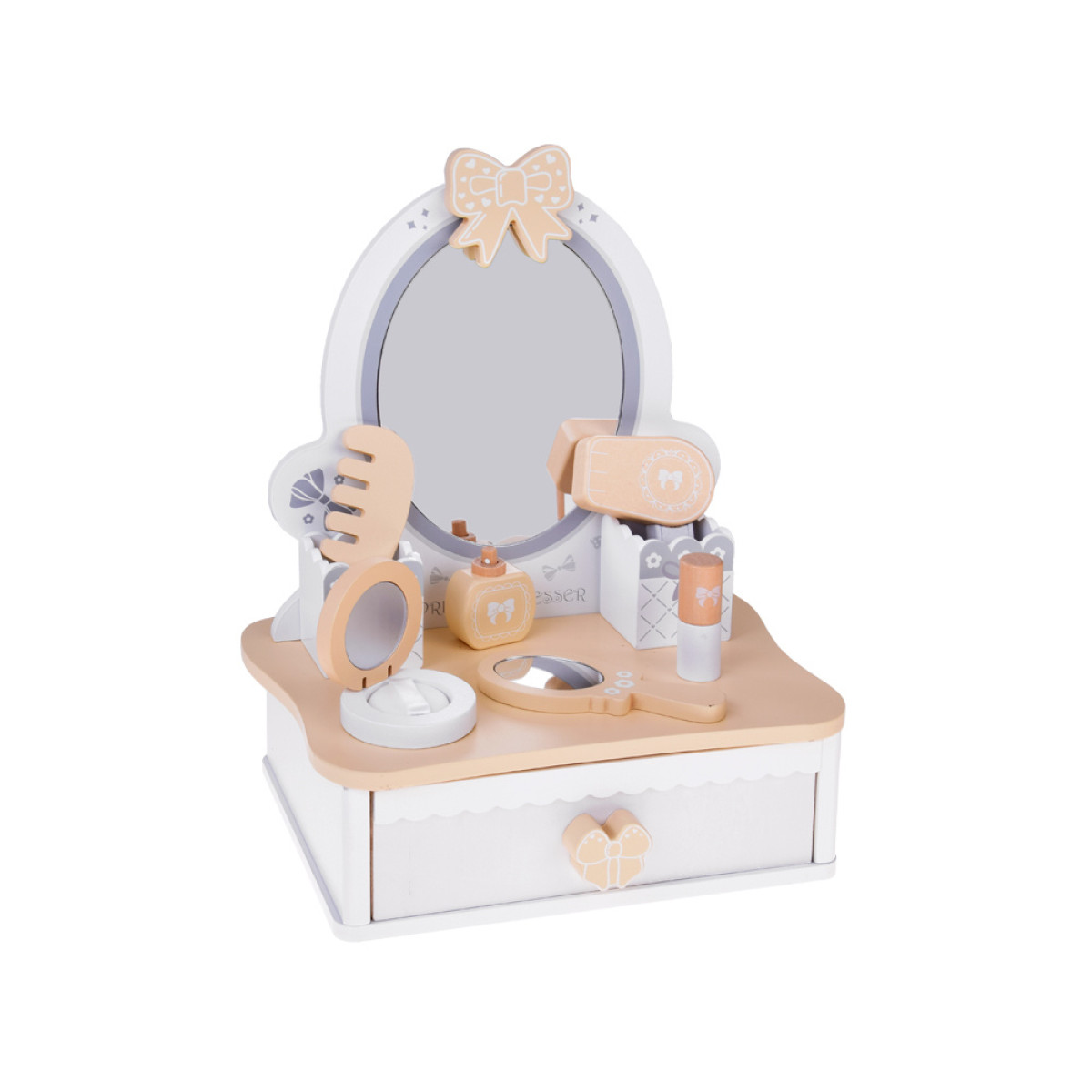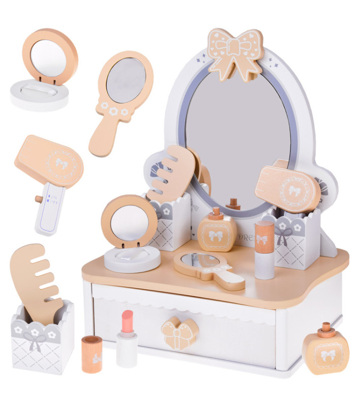 mēbele ir aprīkota ar 2 koka kastītēm, kurās var glabāt rotaslietas, matu aksesuārus un citus sīkumus. Papildus ir ietilpīga atvilktne ar piederumiem. Šis daudzdaļīgais komplekts nodrošina daudzas stundas aizraujošas spēles. Vajadzīga tikai neliela iztēle, lai pārtaptu par grima meistari vai princesi.