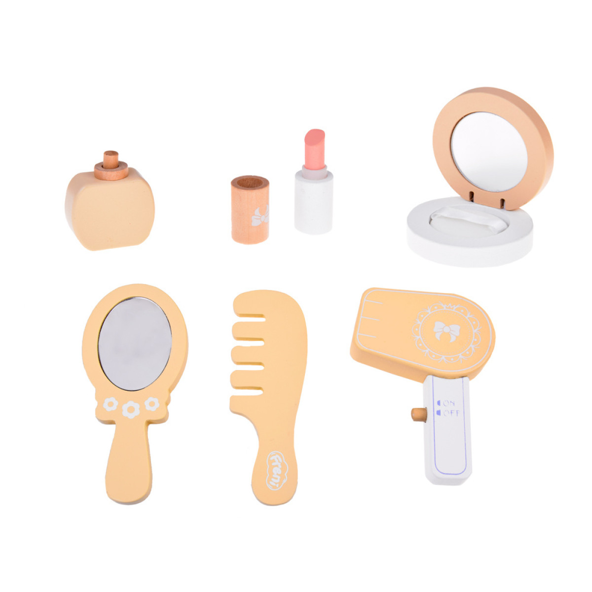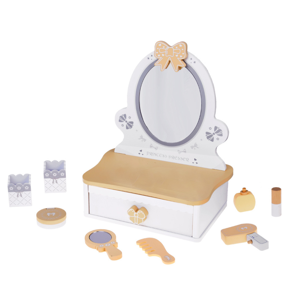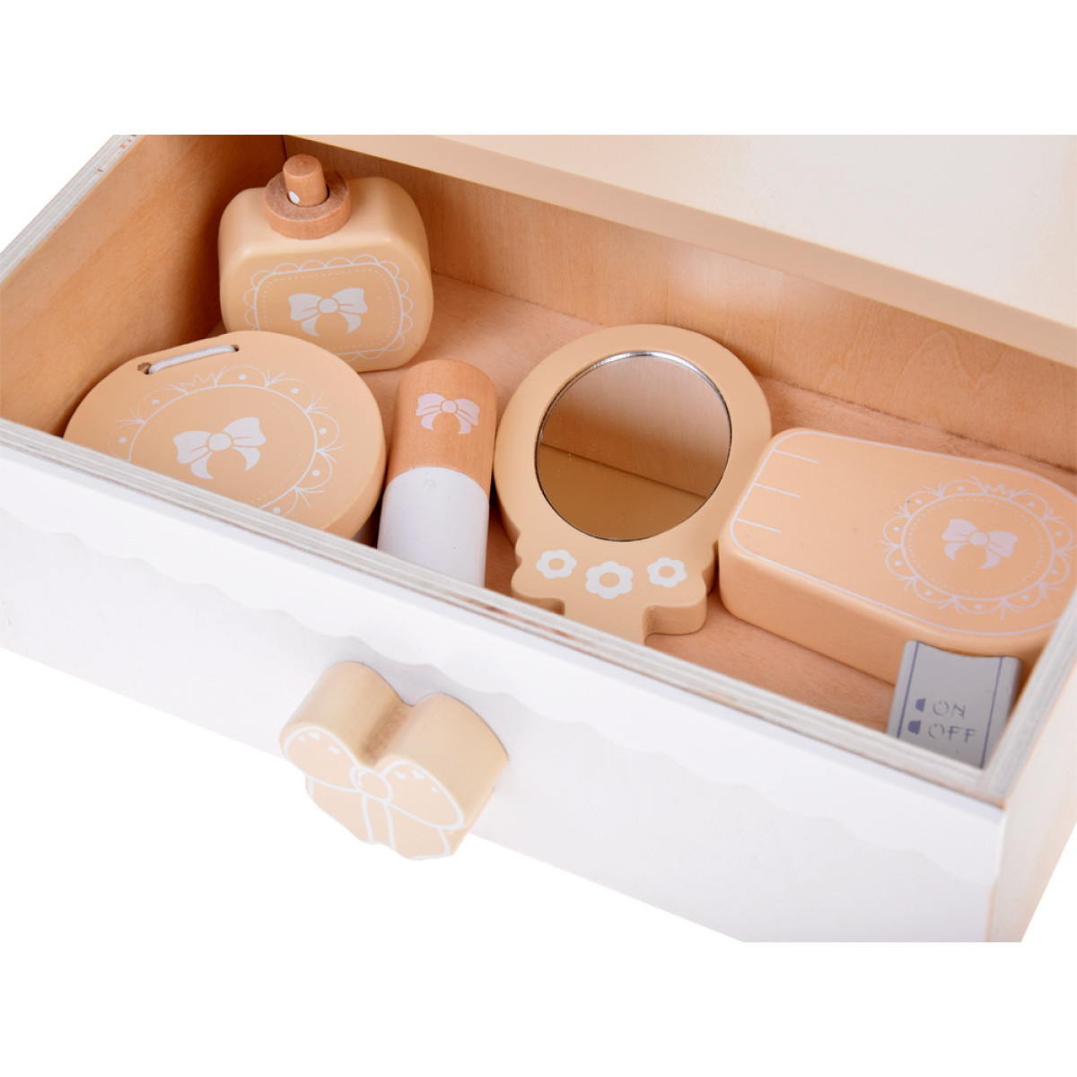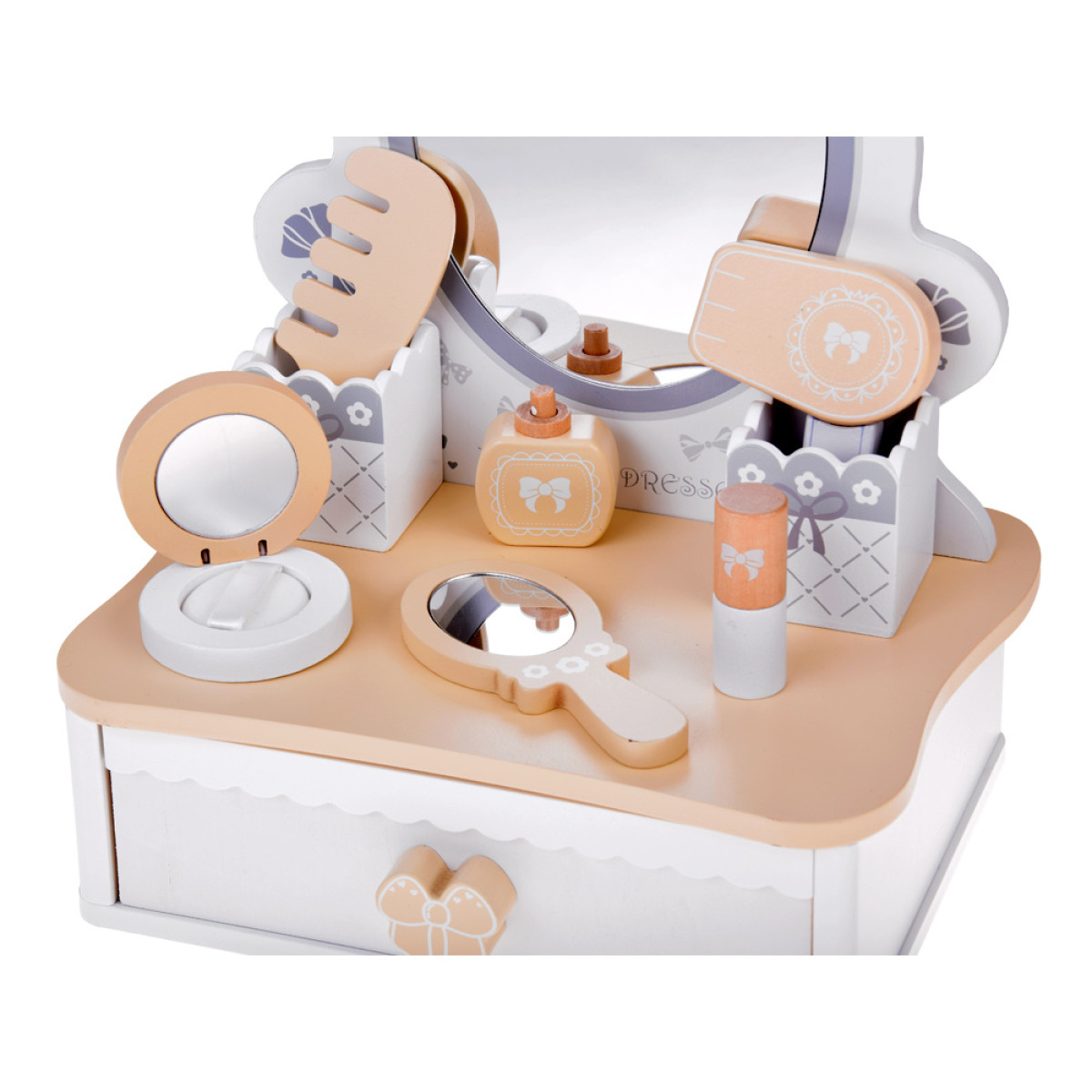 mēbele ir aprīkota ar 2 koka kastītēm, kurās var glabāt rotaslietas, matu aksesuārus un citus sīkumus. Papildus ir ietilpīga atvilktne ar piederumiem. Šis daudzdaļīgais komplekts nodrošina daudzas stundas aizraujošas spēles. Vajadzīga tikai neliela iztēle, lai pārtaptu par grima meistari vai princesi.