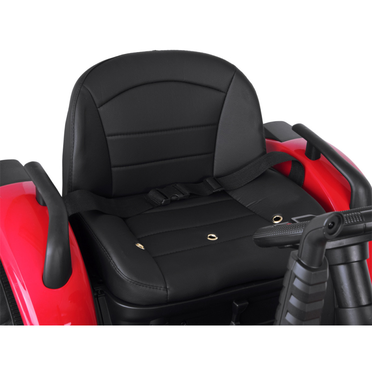 Traktors ir izgatavots no izturīgas plastmasas, bet sēdeklis ar eko ādas pārklājumu nodrošina ērtu sēdēšanu. Braukšanas laikā bērnu stabilizē klēpja drošības josta.