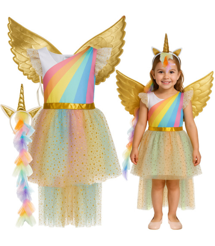 Vienradža kostīms bērniem, tērps masku ballei, burvju komplekts ar kleitu, galvas lentu un spārniem – mazai princesei izmērā 122 - 128 cm KRUZZEL!