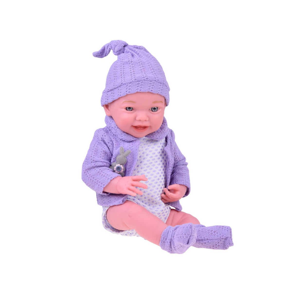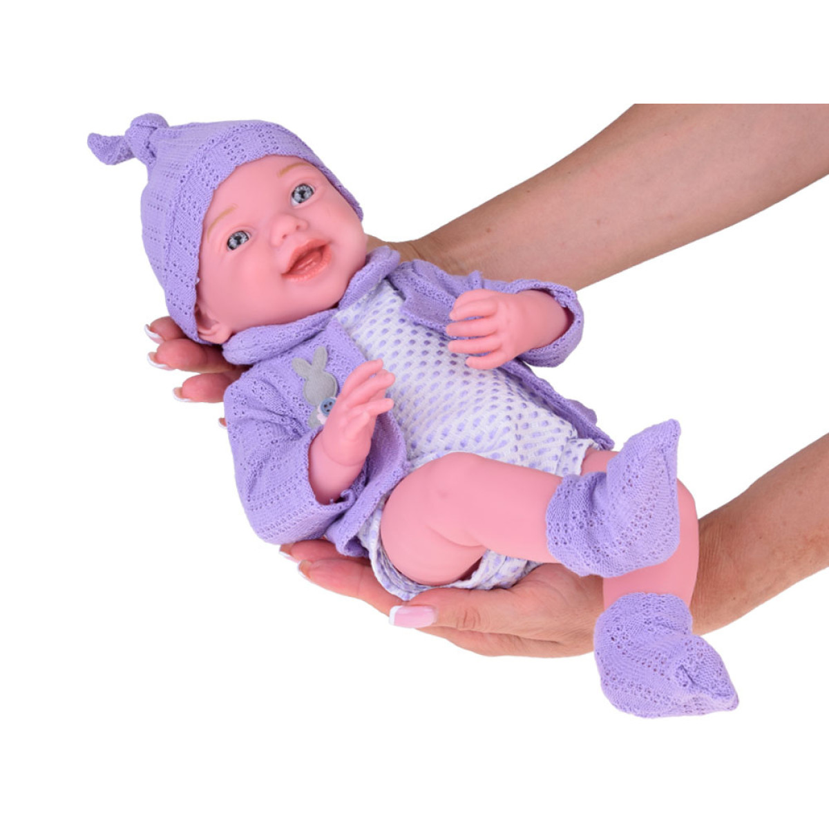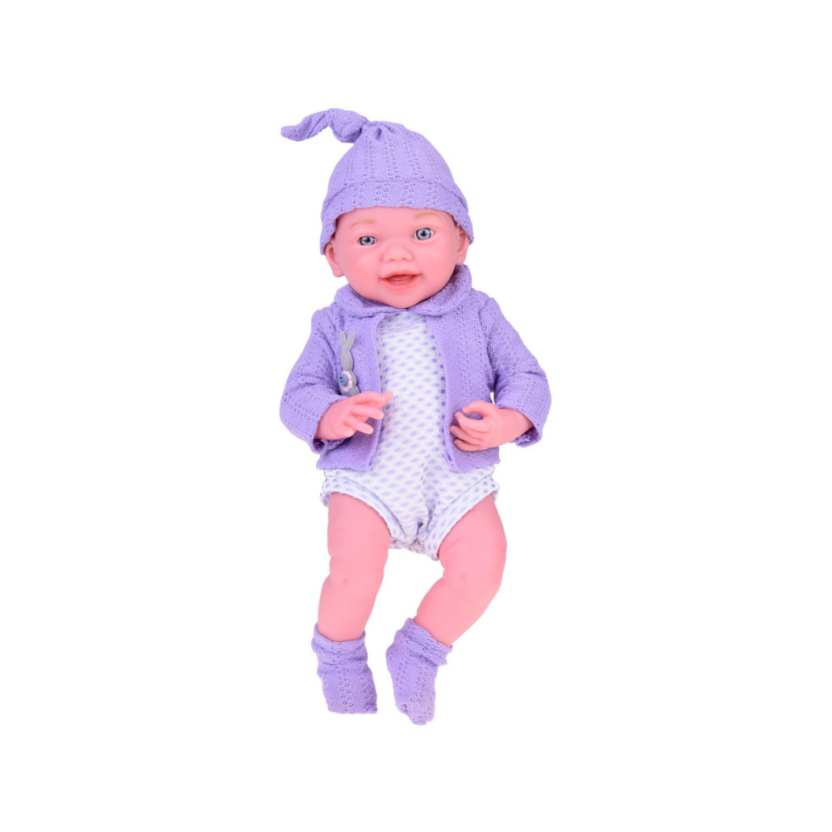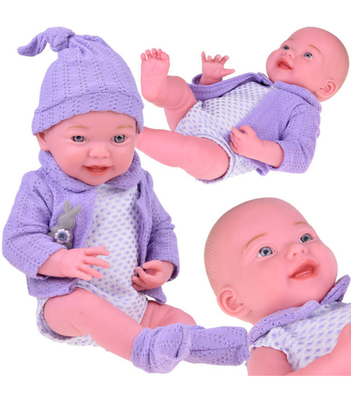Smaidīgs mazulis ar violeto džemperīti un cepurīti ir burvīgā mazuļa atspulgs, kas liks jūsu bērnam pasmaidīt. Lelle ir ģērbta bodijā, džemperītī, zeķēs un cepurītē. Violets džemperītis komplektā ar cepurīti un zeķēm ideāli saskan ar gaišo bodiju ar violetiem punktiņiem. Apģērbs ir rūpīgi izgatavots ar lielu uzmanību detaļām, kas vēl vairāk uzsver šīs unikālās rotaļlietas reālismu un šarmu. Lellei ir kustīgas ekstremitātes.