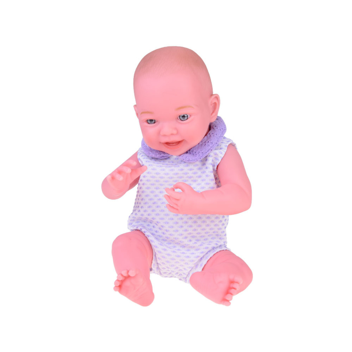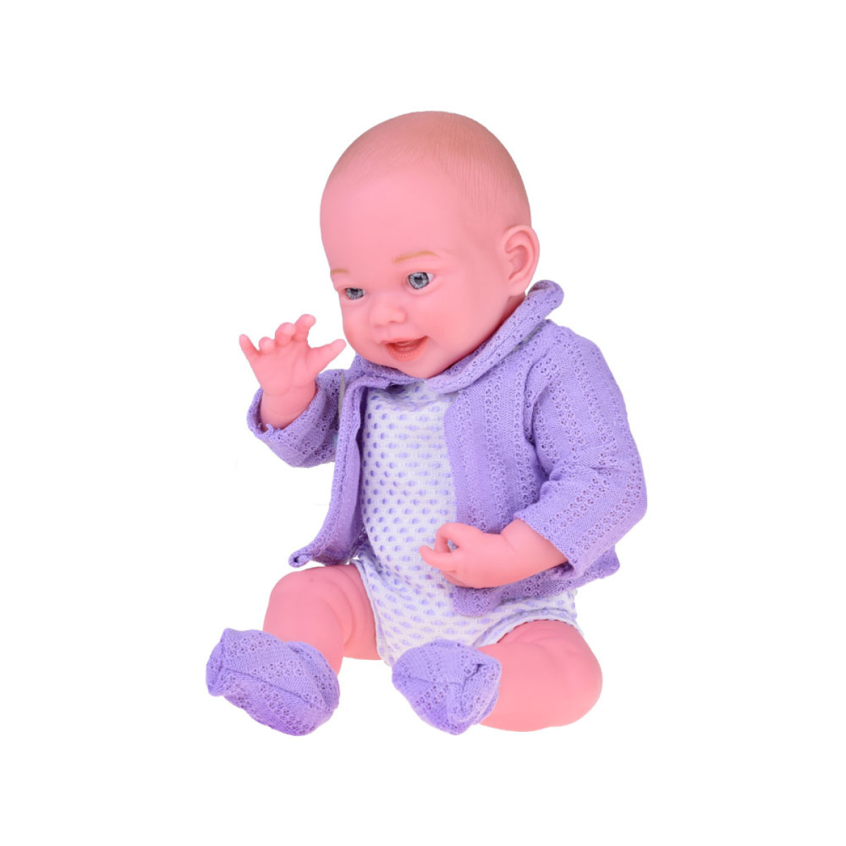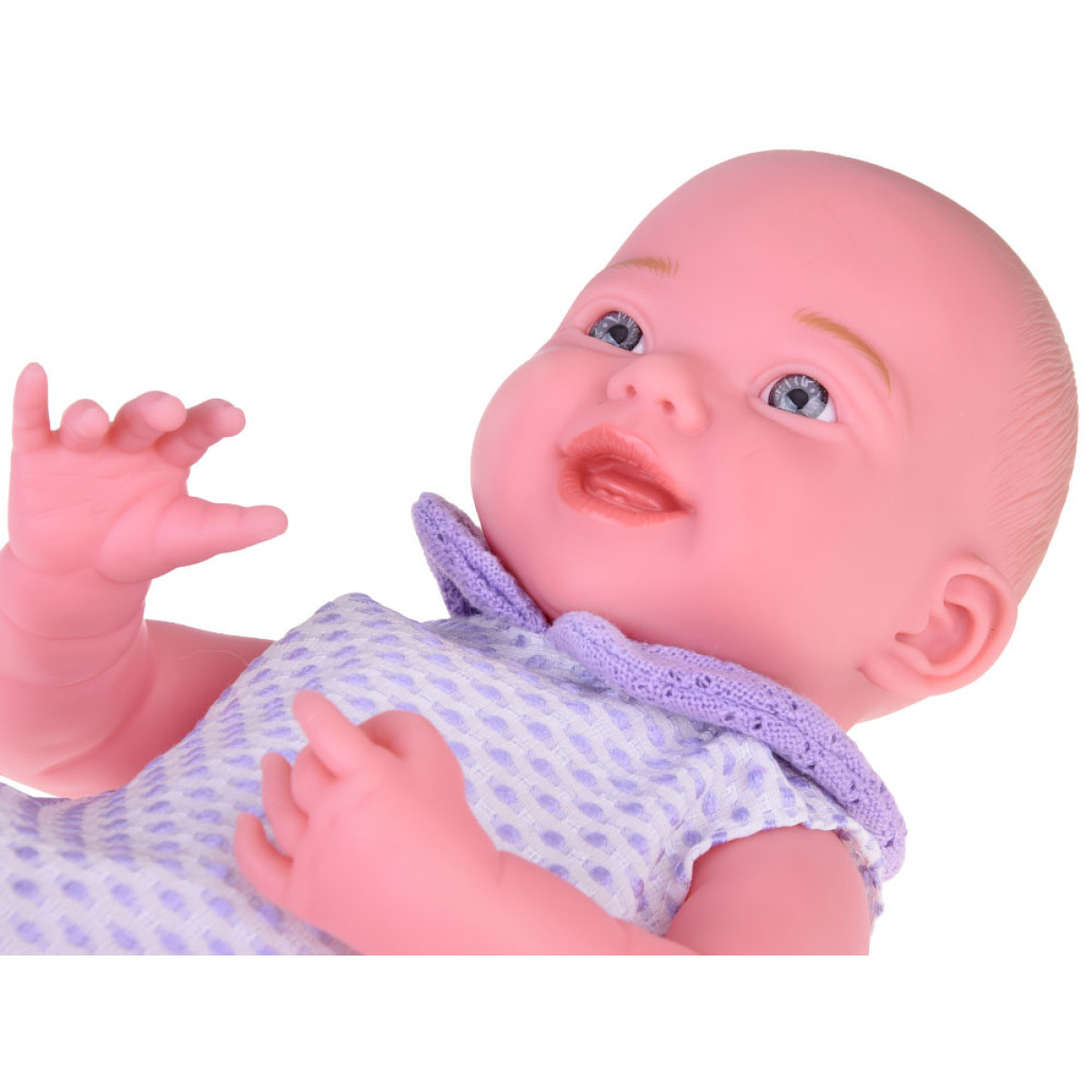 Smaidīgs mazulis ar violeto džemperīti un cepurīti ir burvīgā mazuļa atspulgs, kas liks jūsu bērnam pasmaidīt. Lelle ir ģērbta bodijā, džemperītī, zeķēs un cepurītē. Violets džemperītis komplektā ar cepurīti un zeķēm ideāli saskan ar gaišo bodiju ar violetiem punktiņiem. Apģērbs ir rūpīgi izgatavots ar lielu uzmanību detaļām, kas vēl vairāk uzsver šīs unikālās rotaļlietas reālismu un šarmu. Lellei ir kustīgas ekstremitātes.