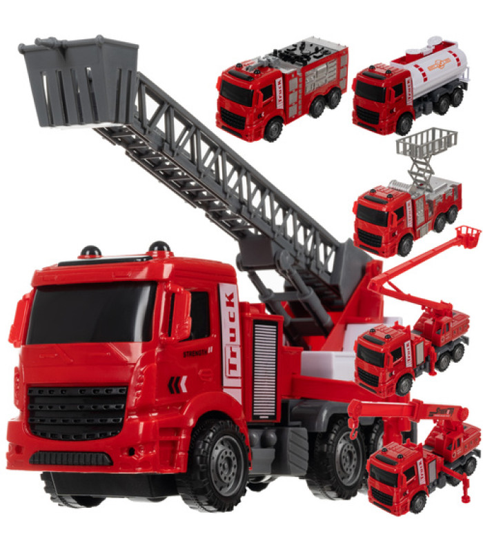 6 funkcionālas automašīnas ar kustīgiem elementiem - komplekts ietver sešas dažādas glābšanas automašīnas, katrai no tām ir unikālas funkcijas un kustīgi elementi, piemēram, izvelkama kāpne ar grozu, izbīdāms pacēlājs, paceļams glābšanas grozs, rotējošas torņi vai ūdens lielgabals.
