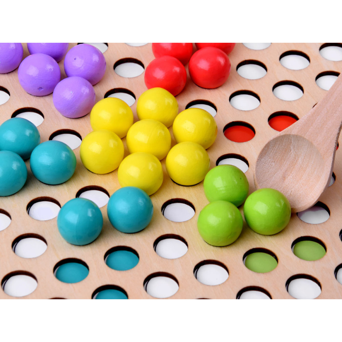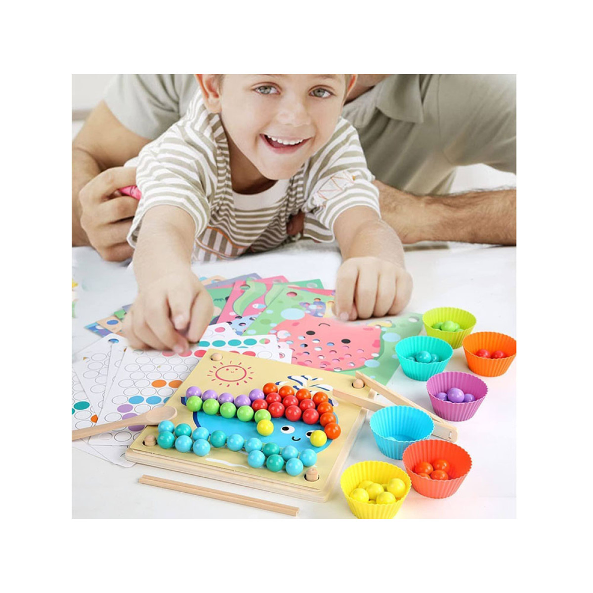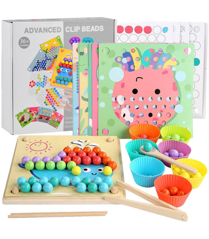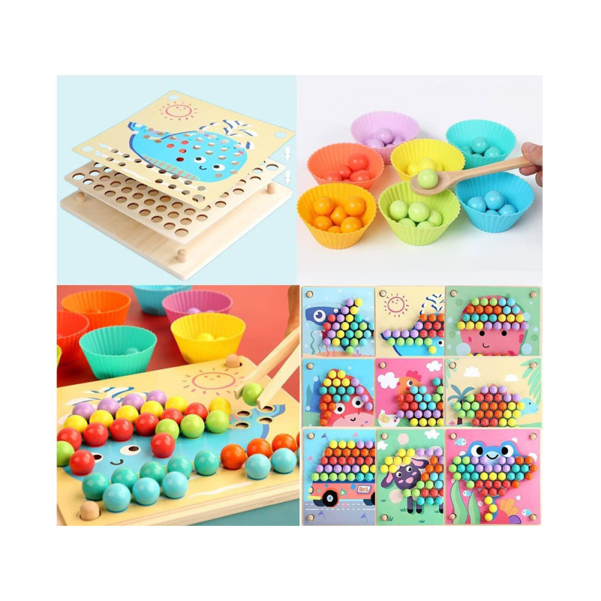 Montessori izglītojošā mozaīka ar koka bumbiņām ir lieliska rotaļlieta bērniem, kas nodrošina izklaidi un prāta treniņu. Priekšrocības un ieguvumi: