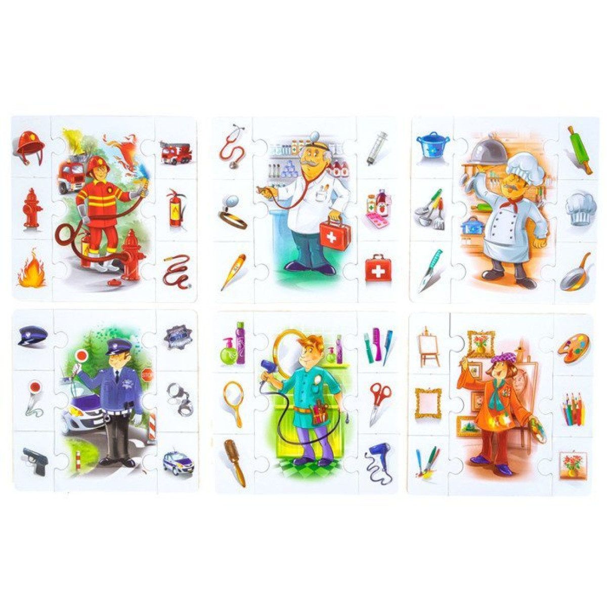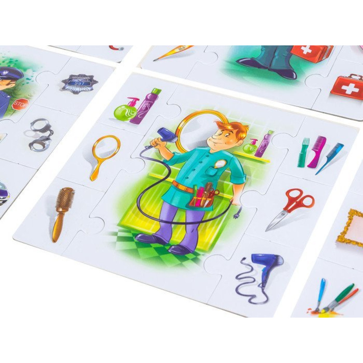 - 6 galvenajiem attēlu dēļiem, kas attēlo dažādas profesijas: policists, mākslinieks, frizieris, ārsts, pavārs, ugunsdzēsējs,