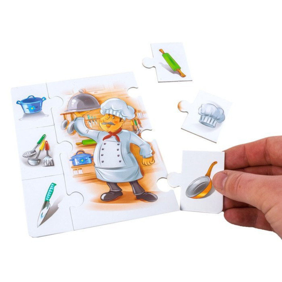 Bērna uzdevums ir pievienot puzles gabaliņus ar rekvizītiem atbilstošajām profesijām. Lai būtu interesantāk, var, piemēram, aprakstīt, kam konkrētais priekšmets tiek izmantots, un bērnam jāatrod atbilstošais elements un jāpievieno tas galvenajam attēlam. Ir vairākas spēļu variācijas, visas aprakstītas pievienotajā instrukcijā. Attēlus un puzles var izmantot arī, lai veidotu savas spēles.