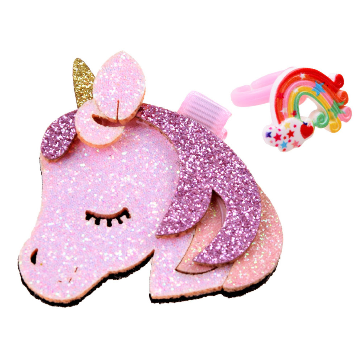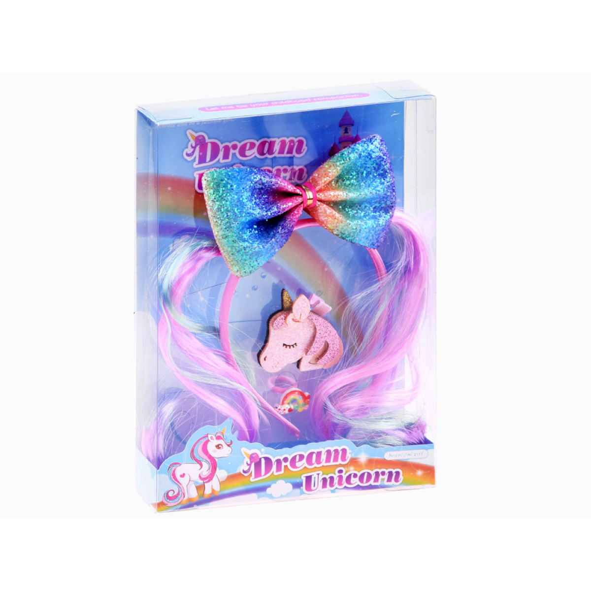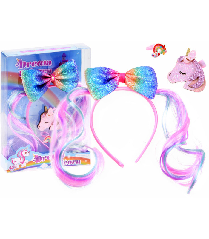 Mirdzoša galvas lente ar ponijiem un loku ir ideāls komplekts jebkurai mazai modes entuziastei. Komplekts ar galvas lenti, matu sprādzi un gredzenu ir lieliska izvēle ikdienas stilizācijai bērnudārzā, dzimšanas dienas ballītē, svinībās vai pastaigā. Plastmasas galvas lente, kas pārklāta ar rozā satīna materiālu, ir ar skaistu mirdzošu loku un krāsainiem poniji. Stilizāciju var papildināt ar mirdzošu matu sprādzi ar vienradzi un plastmasas gredzenu ar varavīksni. Šis frizūru rotas komplekts noteikti patiks daudzām meitenēm.