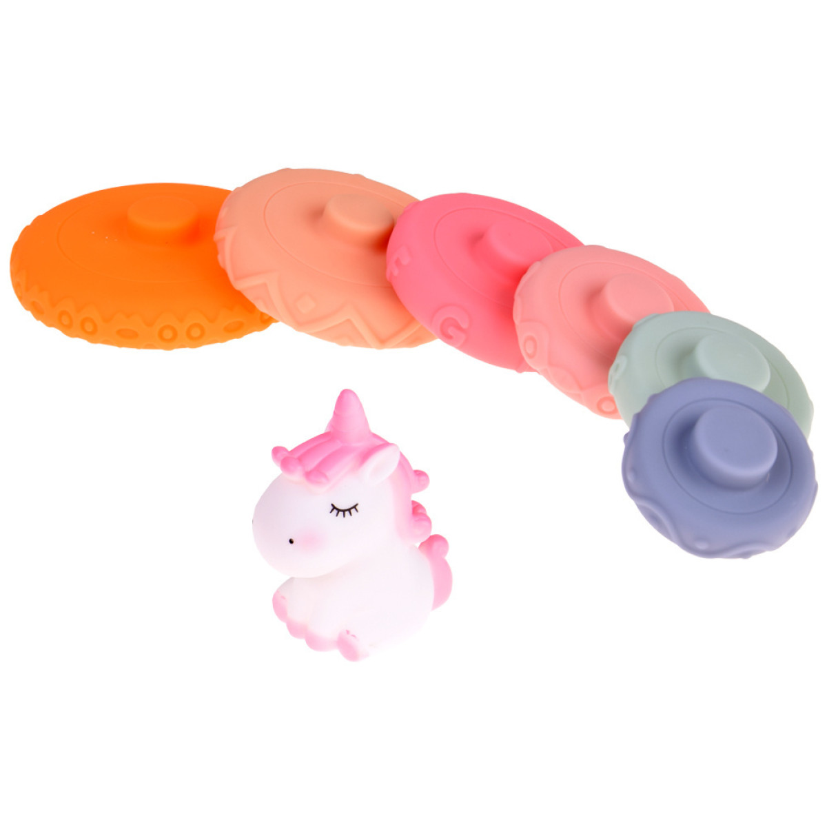- Materiāls: 1 vienradzis un 6 mīksti gredzeni no gumijas, pilnīgi droši mazuļiem.