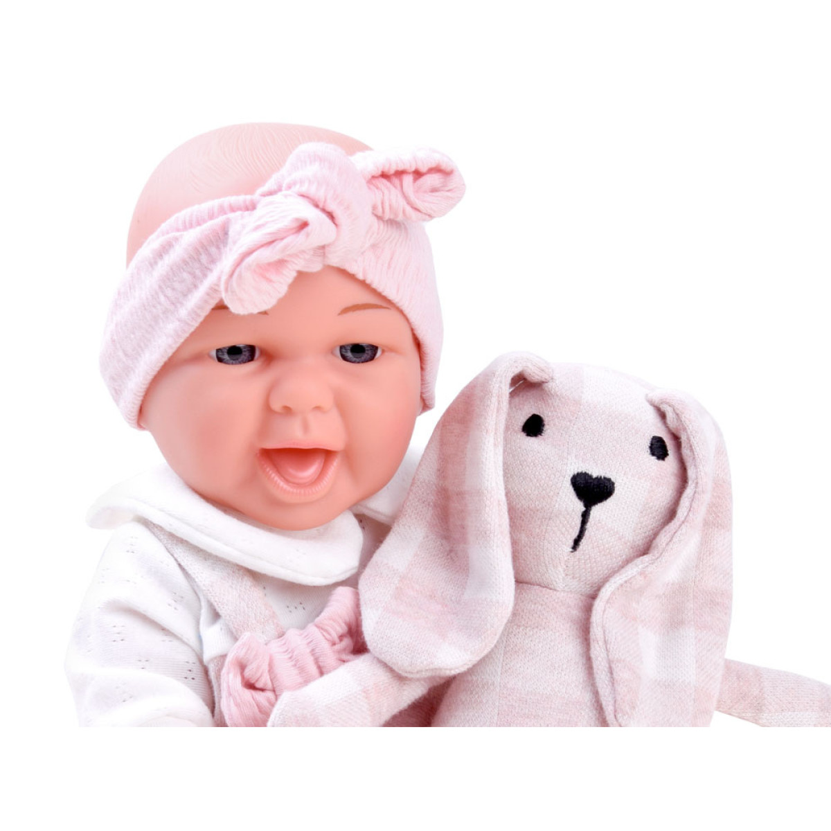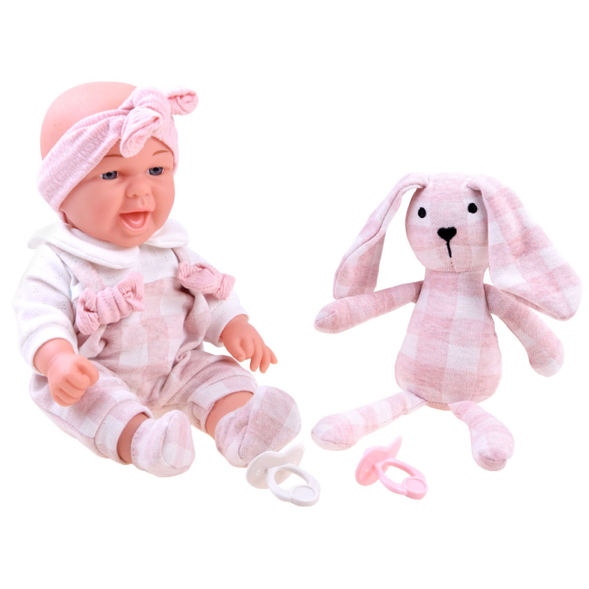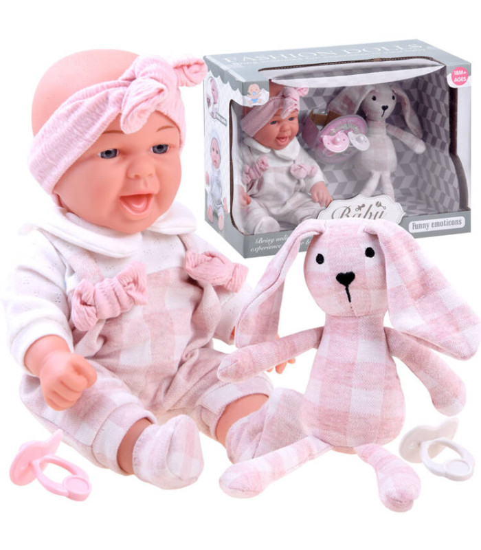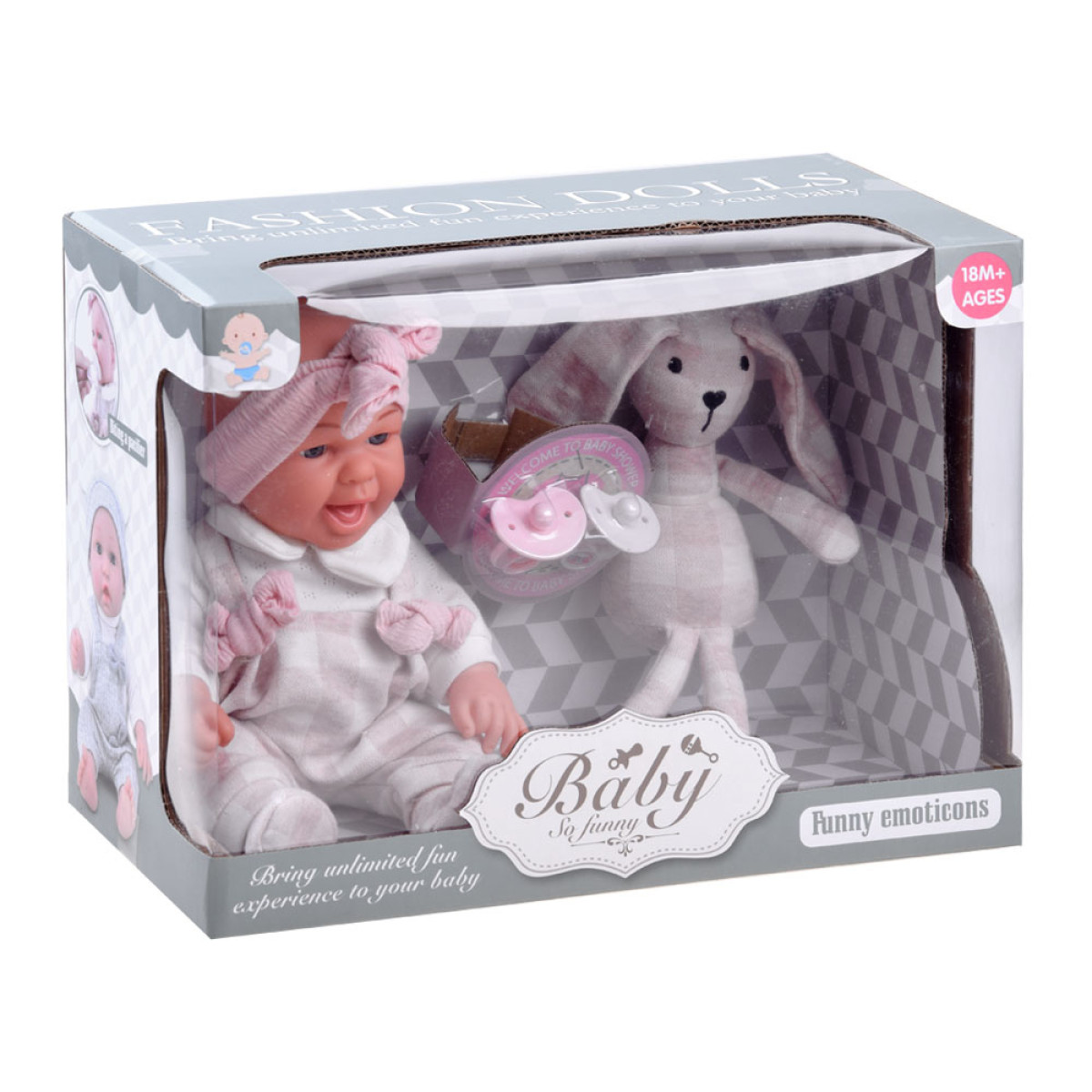 Šarmantīgs bērniņš ar plīša zaķīti, kas izskatās kā mazs zīdainis, noteikti aizraus ne vienas mazas meitenītes sirdi. Komplektā ir patīkama rozā un baltā krāsu gamma. Papildus lellei un zaķītim, komplektā ietilpst divi knupīši: balts un rozā.