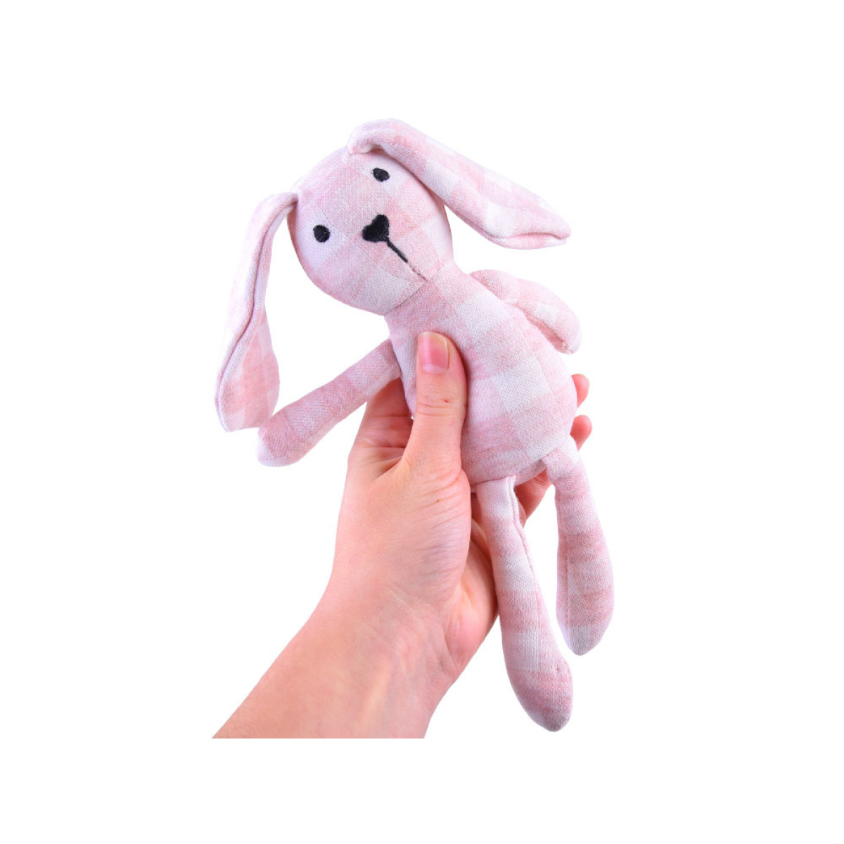 Zīdainis ir ģērbts balt-rozā komplektā: rozā galvas saite, balta blūze apvienota ar rūtainiem šortiem un baltas zeķītes. Bērniņa apģērbs ir mīksts un ļoti patīkams uz tausti. Visus garderobes elementus var noņemt, kad vēlamies pārģērbt mūsu mazulīti. Plīša zaķītim ir izšūtas acis un deguns, un tas ir šūts no tā paša materiāla kā bērniņa šorti. Bērniņš ir ļoti rūpīgi izgatavots, pievēršot uzmanību katrai detaļai, lai maksimāli atgādinātu īstu bērnu, izgatavots no plastmasas - cietas gumijas.