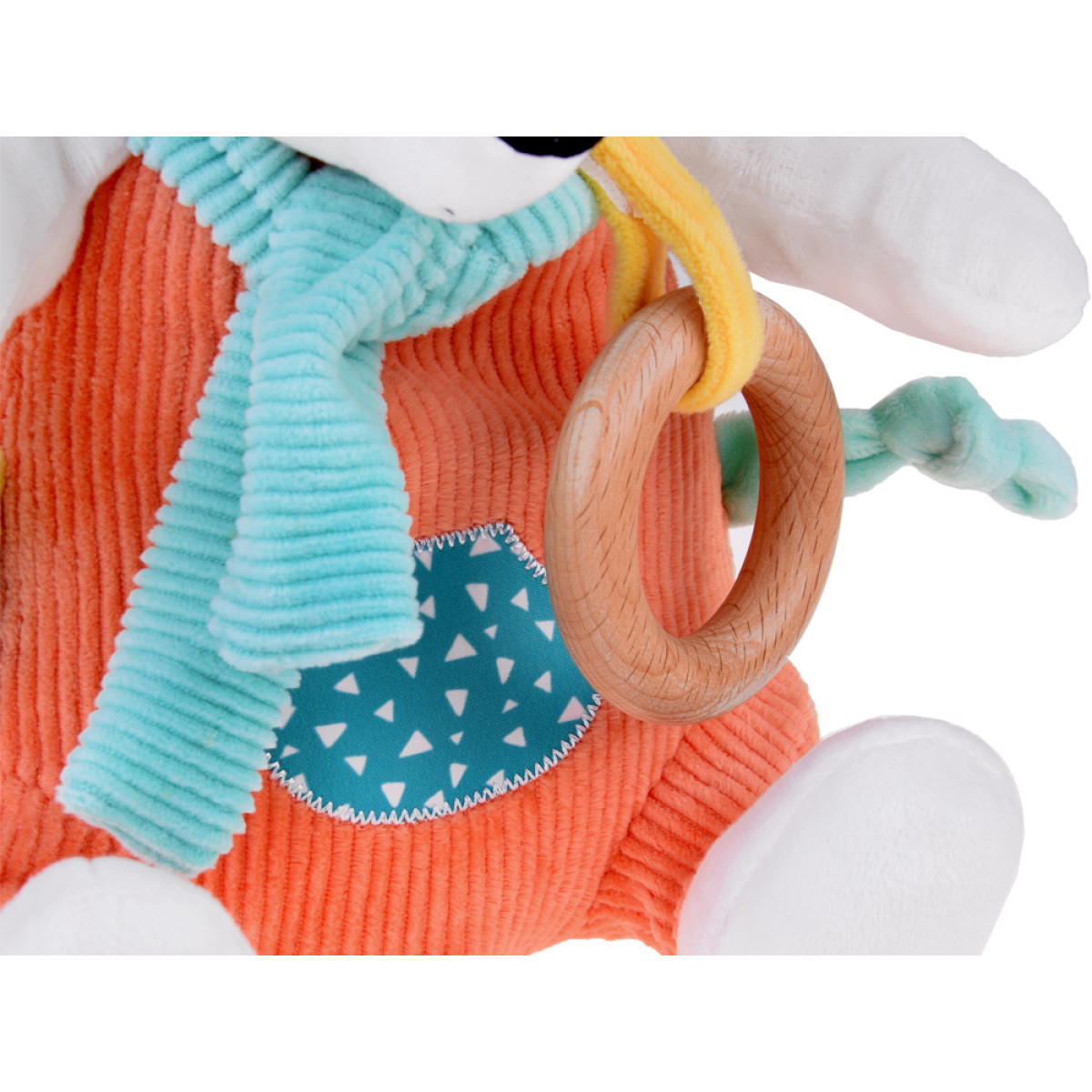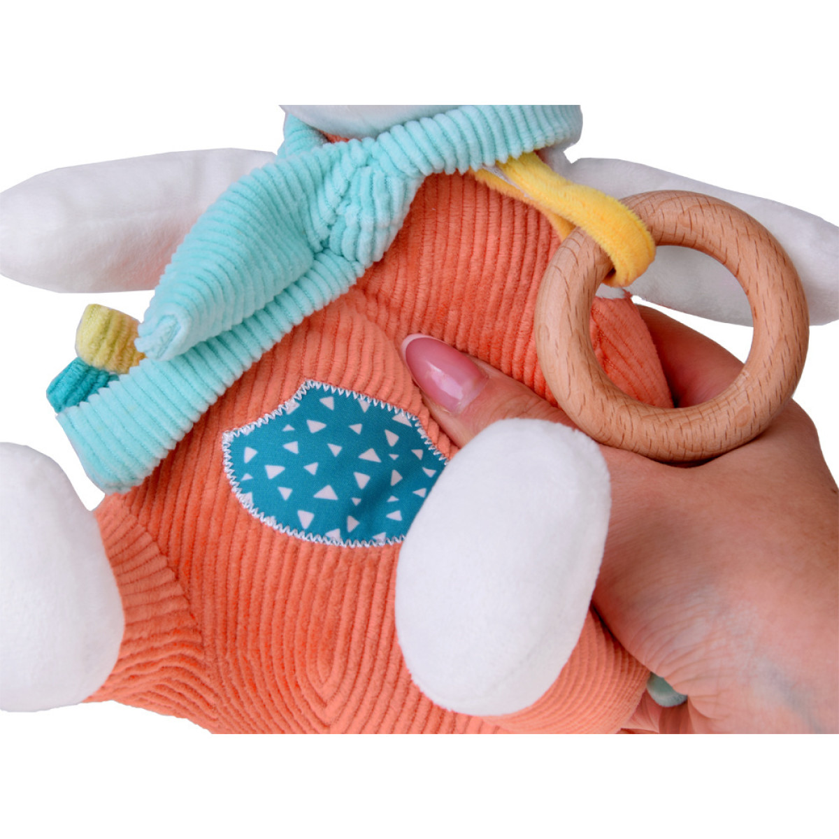Lapsa ir aprīkota ar koka gredzenu, kas ne tikai izskatās estētiski, bet arī ir patīkams pieskārienam un drošs mazulim. Plīša rotaļlietā ir ievietots maigs zvaniņš, kas izdod maigas skaņas katrā kustībā, stimulējot bērna maņas un piesaistot viņa uzmanību.