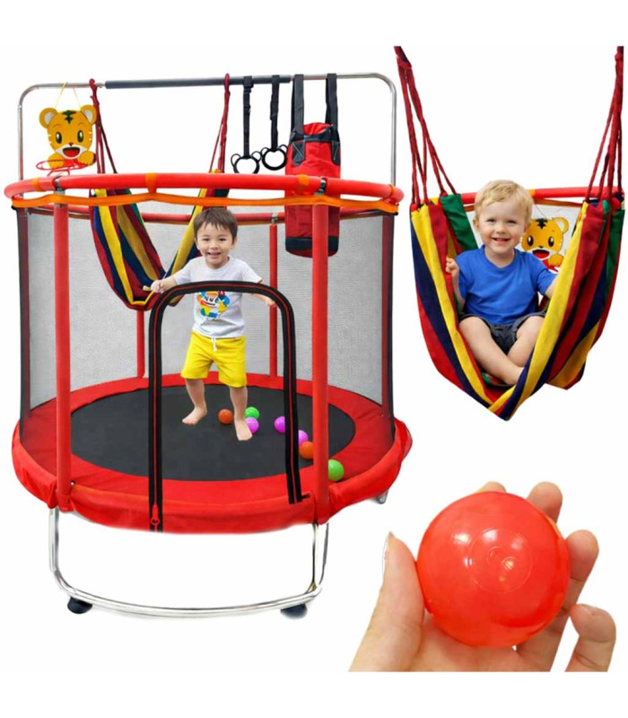 Šis batuts aizrauj ne tikai ar formu, bet arī ar bagātību papildinājumiem, kas parasto lēkšanu pārvērš īstā aktīvas izklaides zonā. Basketbola grozs ar pievilcīgu vairogu mudina uz precīziem metieniem, bumbiņa un pumpis ļauj uzreiz sākt spēli, bet bumbiņu komplekts dažādo kustību un koordināciju. Hamakā ar uzglabāšanas somu var atpūsties, pievilkšanās riņķi stiprina muskuļus, un boksēšanas maiss ar cimdiem piešķir katrai izklaidei emocijas un enerģiju. Batuts ātri kļūst par ikdienas aktivitāšu centru svaigā gaisā.