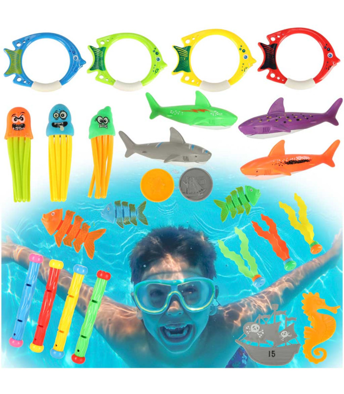 27 rotaļlietu komplekts peldbaseinam piedāvā: