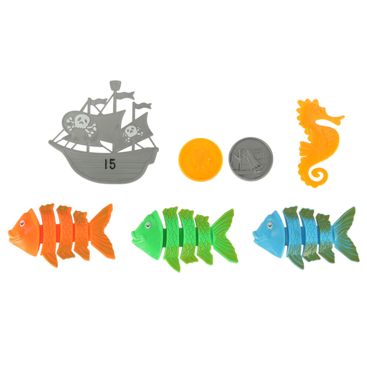 Šis bērnu rotaļlietu komplekts noteikti noderēs, mācoties peldēt vai nodarbojoties ar sensorās integrācijas vai motorikas nodarbībām. Dažādu formu un krāsu zivtiņas palīdzēs bērnam pierast pie ūdens, mudinot izpētīt zemūdens pasauli.