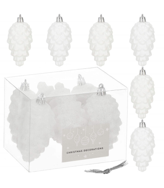 Atklājiet svētku maģisko mirdzumu ar Springos® Ziemassvētku eglīšu rotājumiem, kas valdzina ar savu unikālo dizainu. Katrs čiekura formas rotājums ir pārkaisīts ar baltiem mirdzumiem, padarot to par uzmanības piesaistītāju un piešķirot jūsu Ziemassvētku eglītei unikālu pieskārienu. Šajā komplektā ir seši gabali, kas ļauj jums izveidot harmonisku un elegantu kompozīciju uz jūsu eglītes, piešķirot tai svētku mirdzumu.
