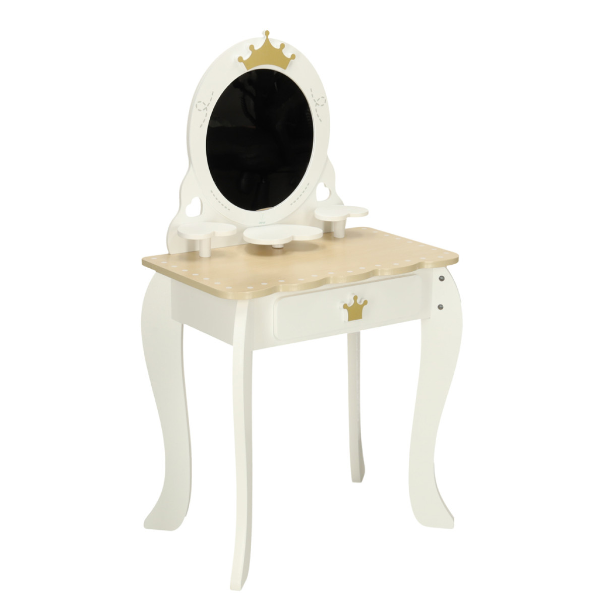 Tualetes galdiņš ar aksesuāriem ir pilnībā izgatavots no koka, kas ir gludi noslīpēts un krāsots ar netoksiskām krāsām. Balto un zelta krāsu kombinācija padara komplektu par lielisku bērna istabas rotājumu.