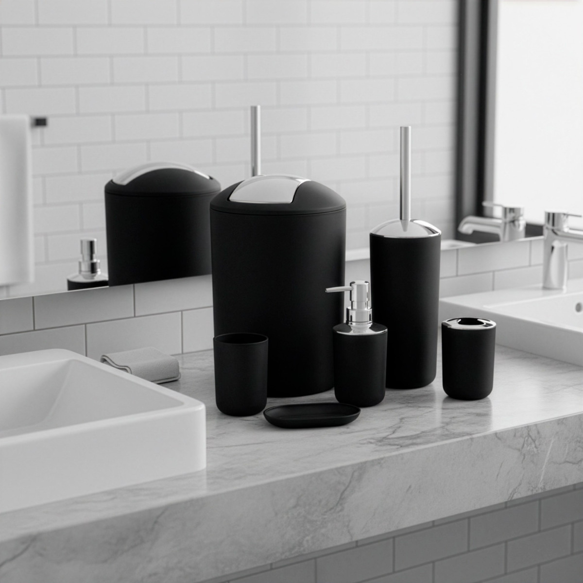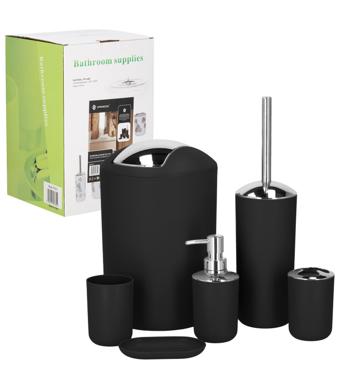 praktisks un elegants vannas istabas piederumu komplekts, kas palīdz uzturēt kārtību un piešķir telpai saskaņotu izskatu. komplektā ir 6 noderīgi piederumi, kas ikdienā atvieglo vannas istabas lietošanu. melnās un sudraba krāsas kombinācija ar matētu un spīdīgu apdari izskatās moderni un viegli sader ar dažādiem interjeriem.