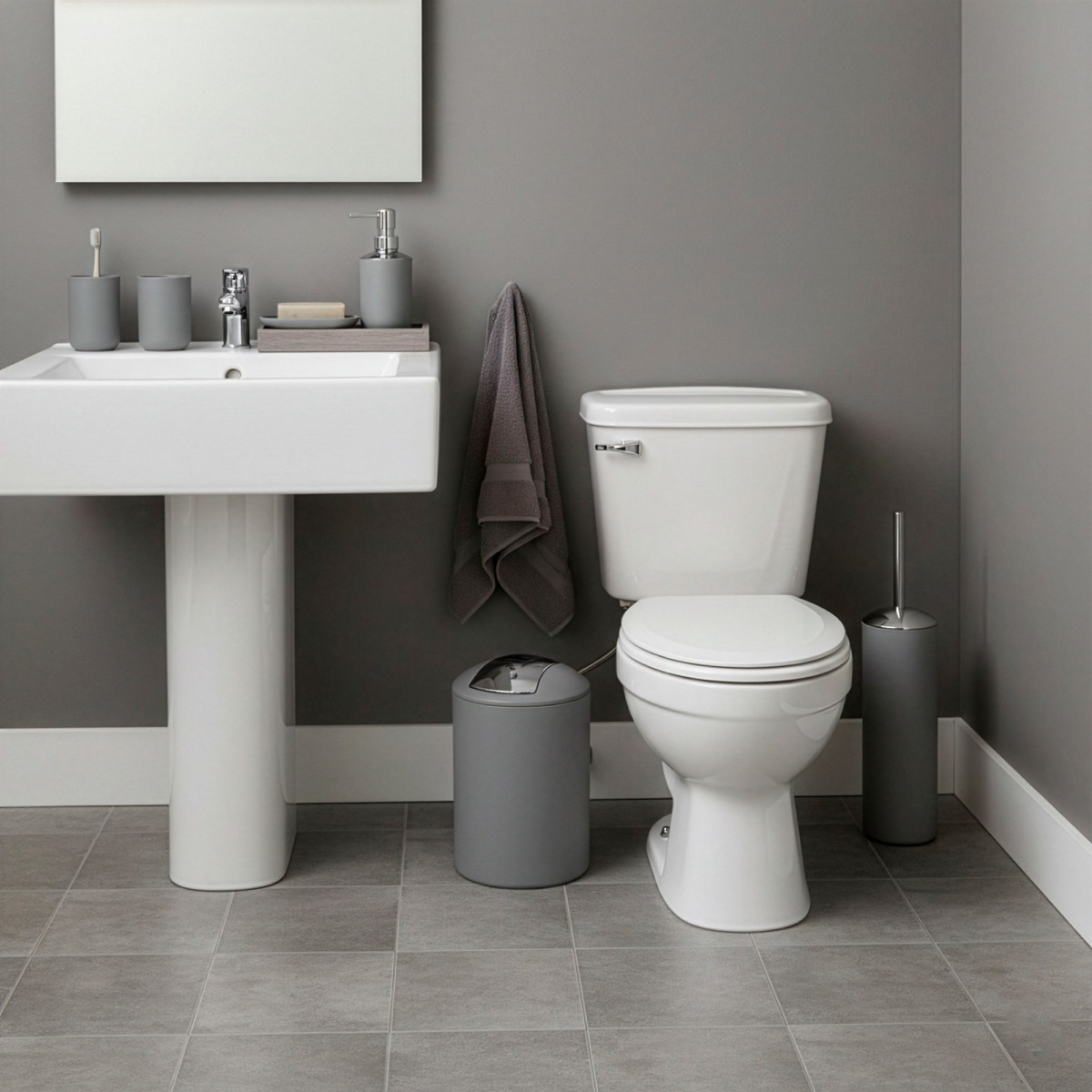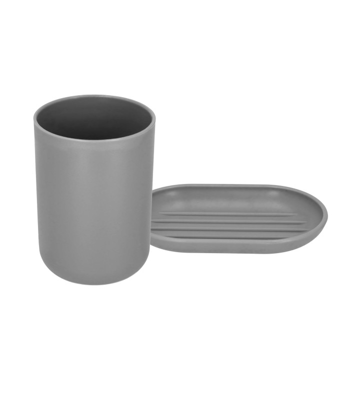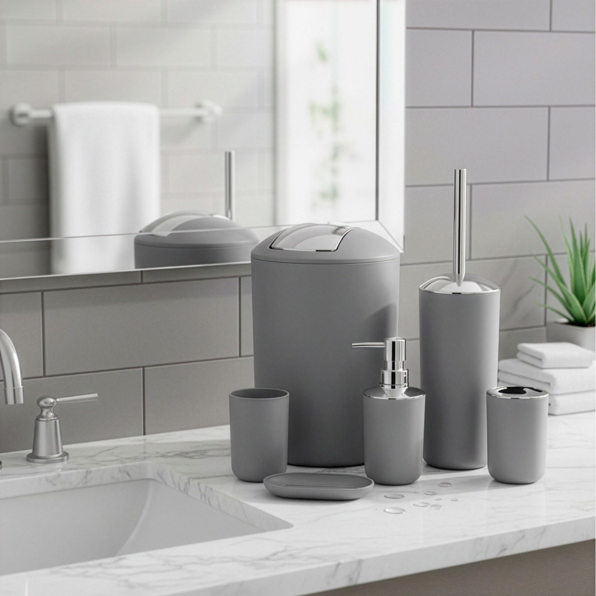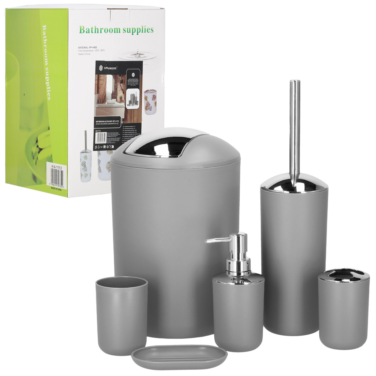 praktisks un stilīgs vannas istabas piederumu komplekts, kas palīdz uzturēt kārtību un piešķir telpai vienotu izskatu. komplektā ir 6 ikdienā noderīgi piederumi pelēkā un sudraba krāsā ar matētu un spīdīgu apdari. izgatavots no pp materiāla, kas ir viegls, izturīgs un piemērots lietošanai vannas istabā.