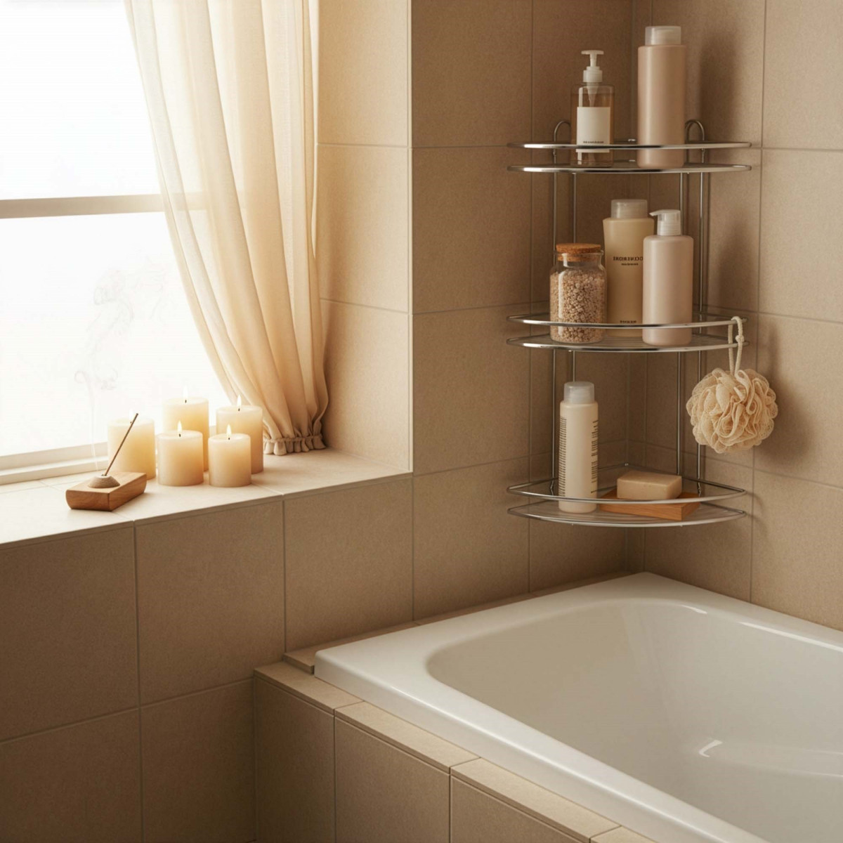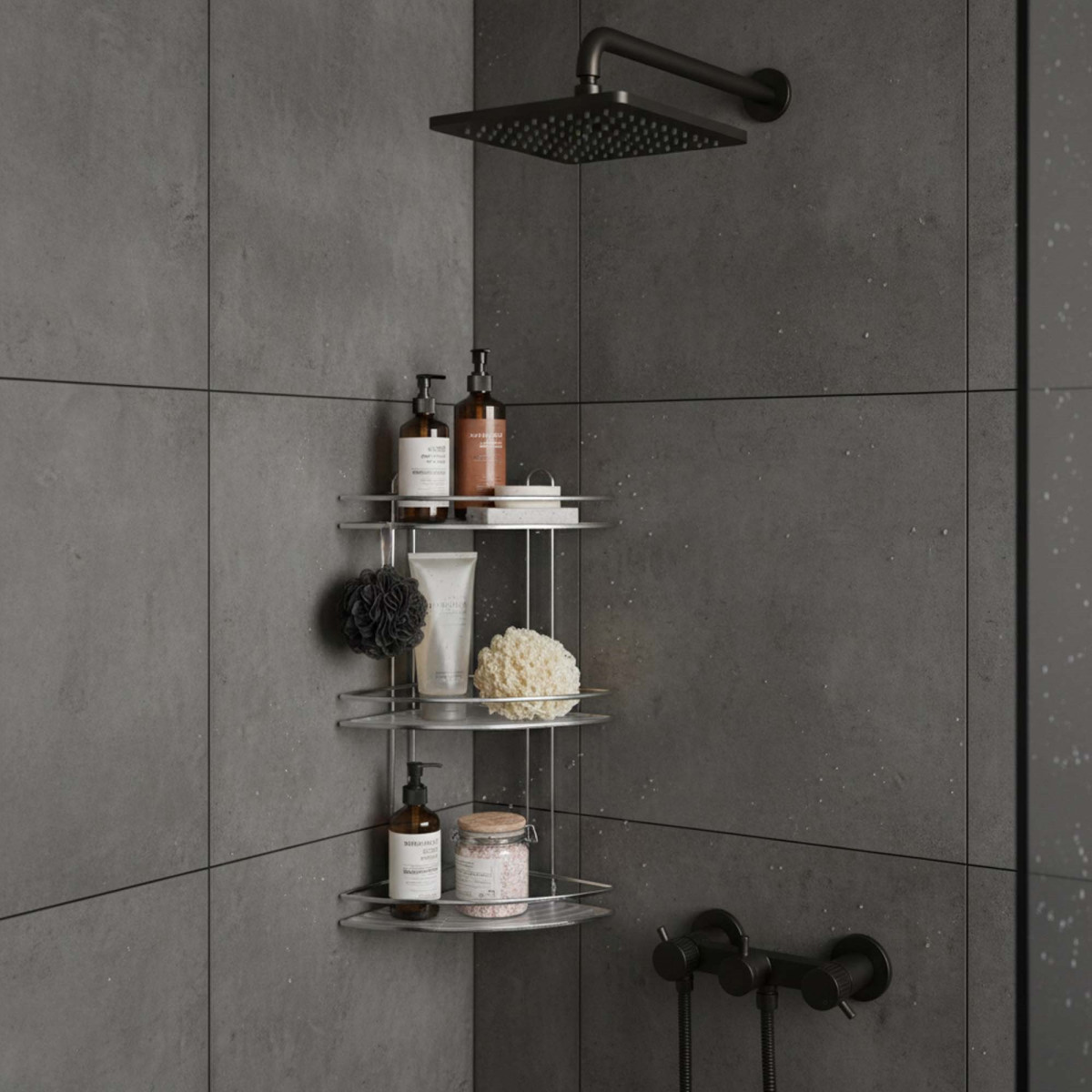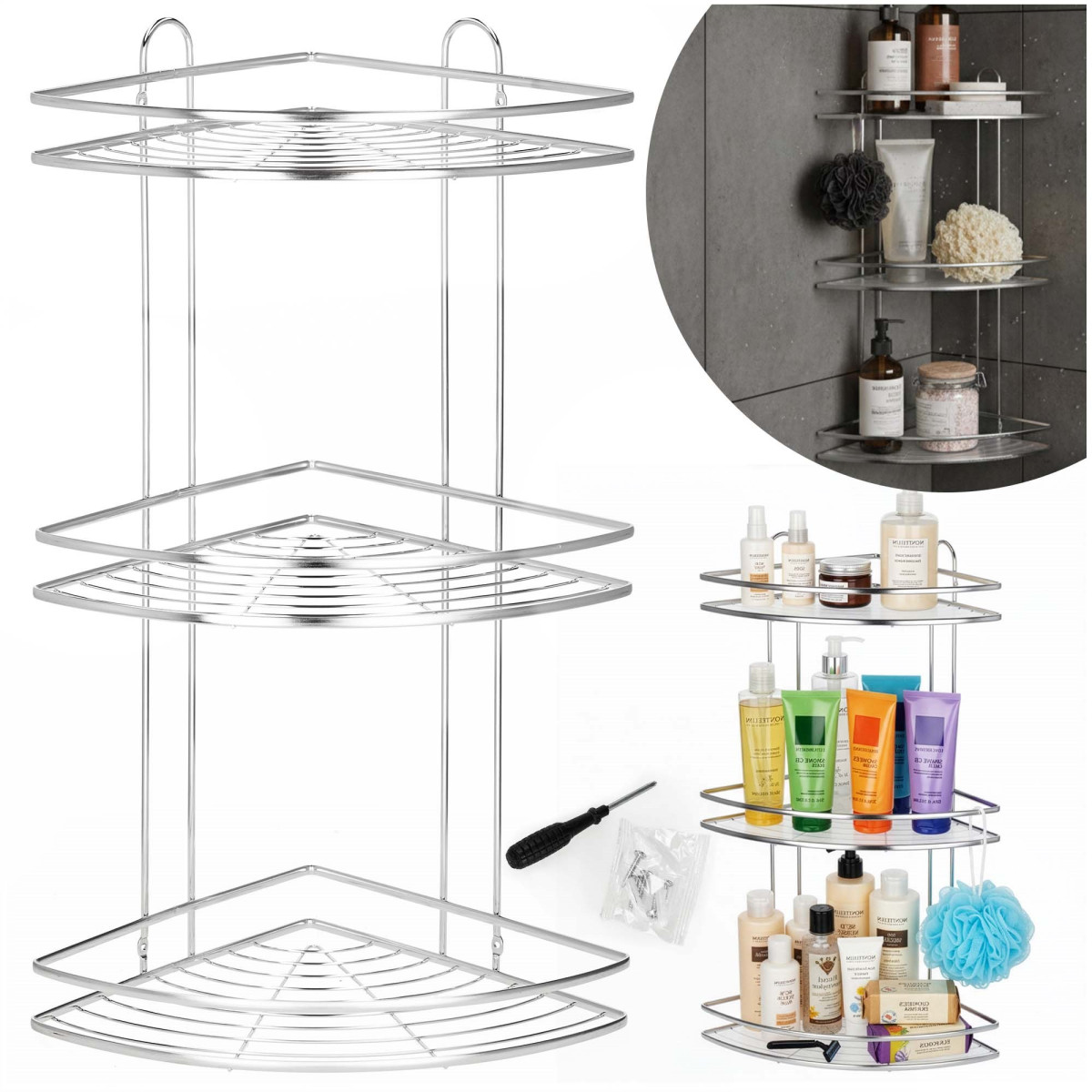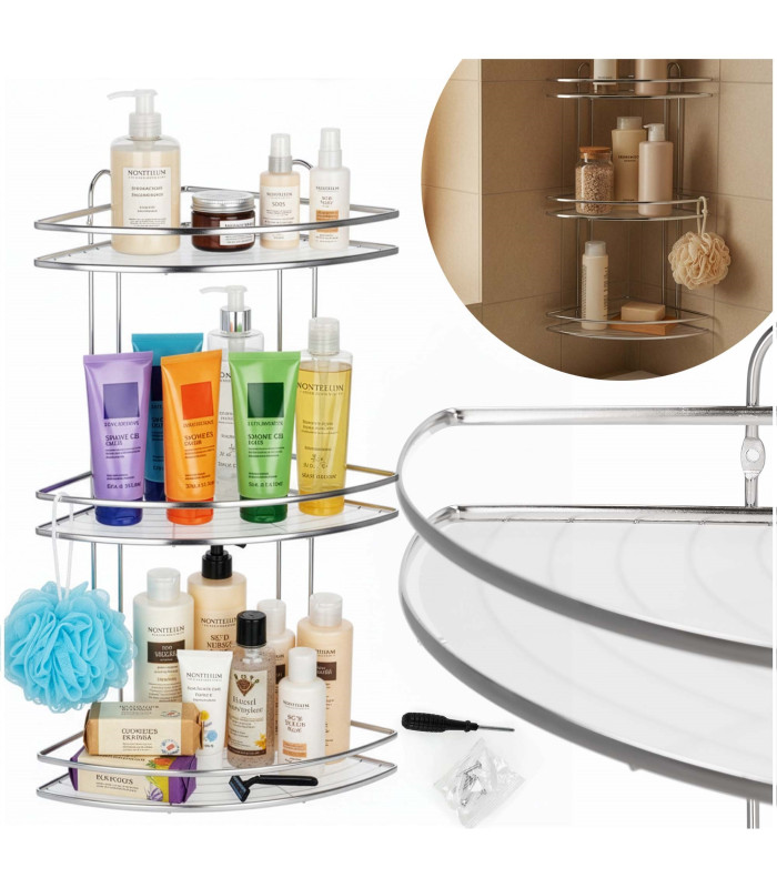 praktisks un kompakts vannas istabas stūra plaukts, kas palīdz ērti izmantot brīvo stūri un uzturēt kārtību vannas istabā. plaukts ir izgatavots no nerūsējošā tērauda, tāpēc tas ir piemērots mitrām telpām un ikdienas lietošanai. sudraba krāsa un trīsstūra forma ļauj to viegli pieskaņot dažādiem interjeriem.