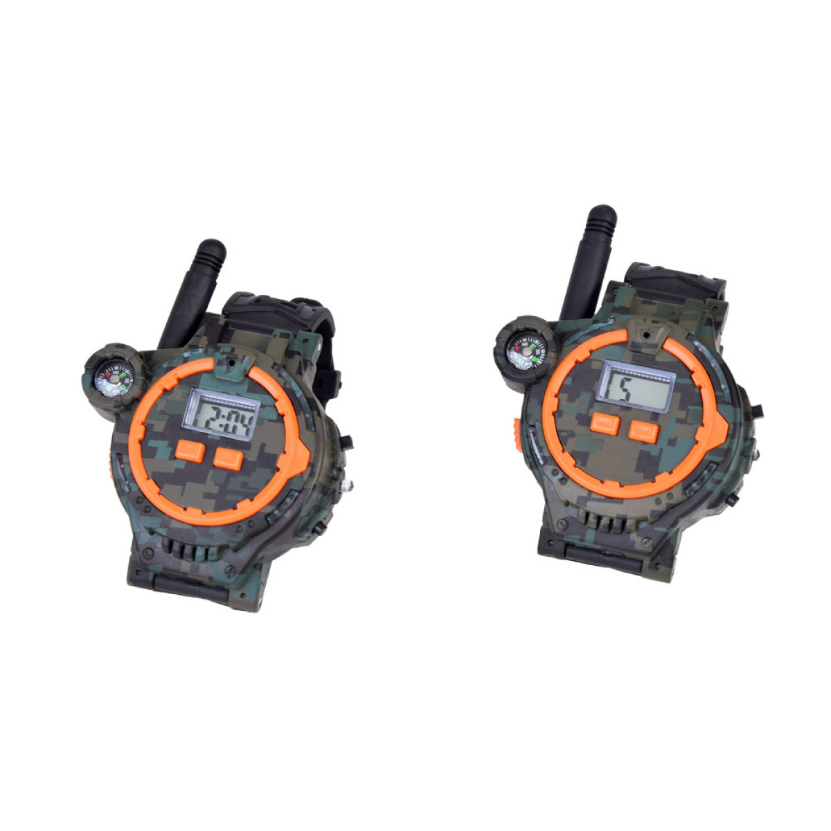 Bērniem paredzētie walkie talkie ir rotaļlieta, kas ļauj sazināties ar citu personu attālumā. Tā ir lieliska ierīce bērniem, kas mīl spēlēties ar vienaudžiem brīvā dabā. Rotaļlieta ir izgatavota no plastmasas kamuflāžas krāsā, savukārt gumijas siksna ir melnā krāsā. Tā ir viegla un izskatās kā profesionāla ierīce. Nav nepieciešams to turēt rokā. Šādas krāsas neļaus Jūs atrast spēles laikā.