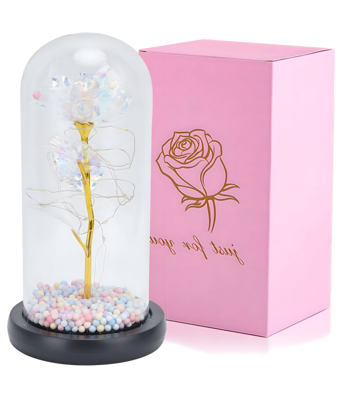 Mūžīgā roze stiklā ar LED apgaismojumu ir unikāla dāvana, kas izskatās kā īsta balta roze. Priekšrocības: Izsmalcināts dizains, ilgmūžība un elegants apgaismojums. Ieguvumi: Ideāli piemērota jebkuram notikumam, ilgstoša skaistuma saglabāšana bez nepieciešamības pēc ūdens un kopšanas.