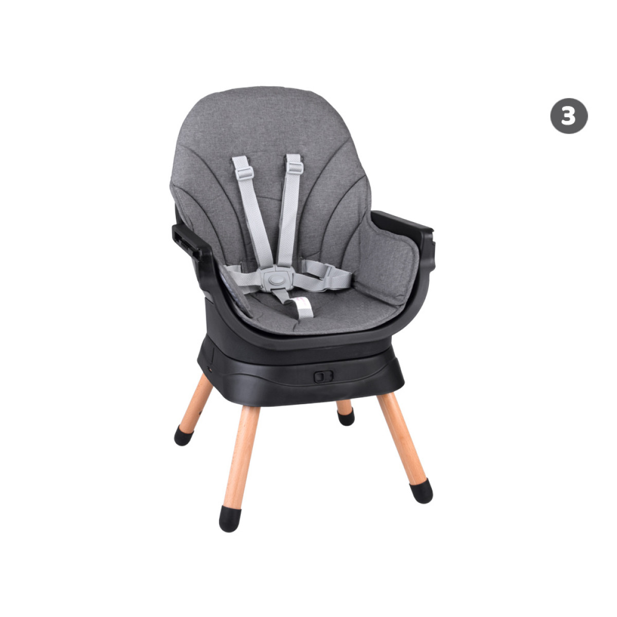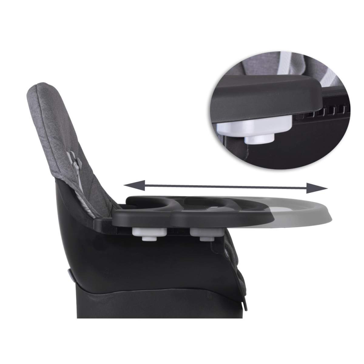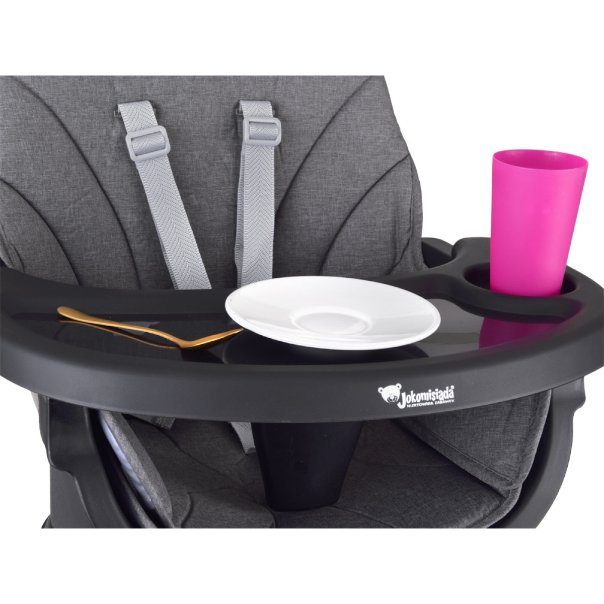 - Krēsls bērnu barošanai - ērts un stabils, ar regulējamu paplāti un drošības jostām, nodrošina komfortu gan bērnam, gan vecākiem. Paplāte ir profilēta, noņemama un viegli tīrāma - to var noskalot zem tekoša ūdens vai ievietot trauku mazgājamā mašīnā.