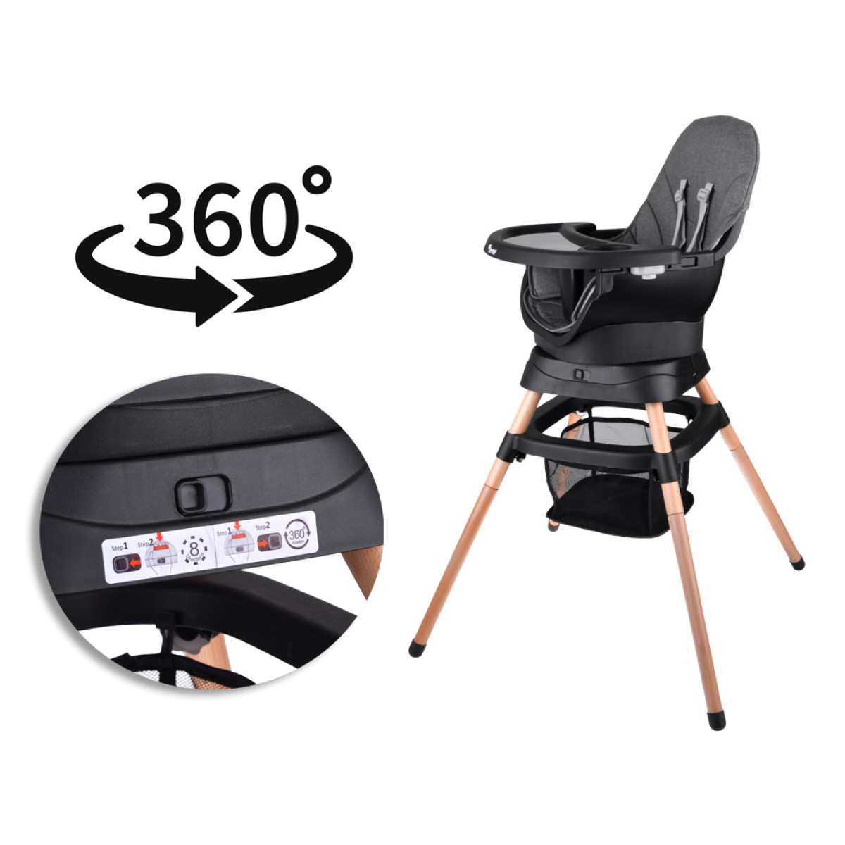 - 360° rotējoša sēdekļa ar 8 bloķēšanas pozīcijām - maksimāls komforts un pielāgošanās jebkurai situācijai.