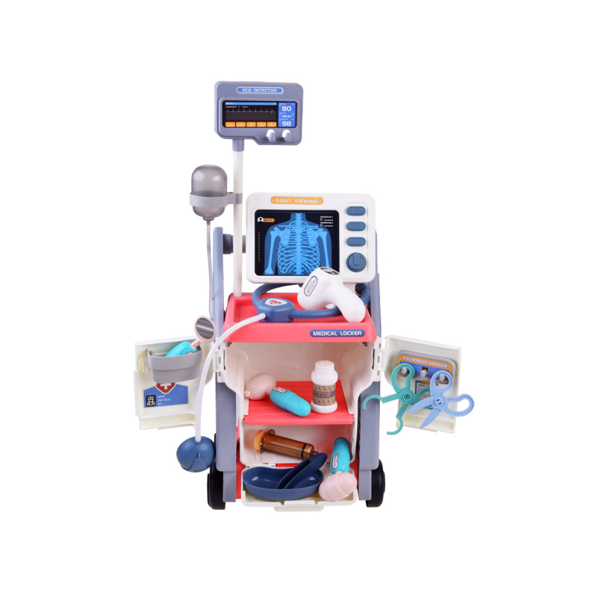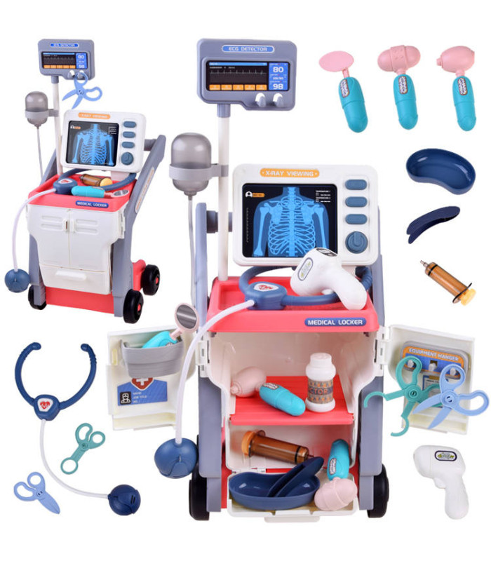 Ērti lietojamie ratiņi satur visus nepieciešamos piederumus. Ar šo komplektu visi lelles, rotaļu lāči un pat vecāki vienmēr būs veseli. Mazo mediķis var mērīt temperatūru, veikt injekcijas, pārbaudīt sirdi vai redzi, pieslēgt sistēmu, veikt rentgenu un daudz ko citu.