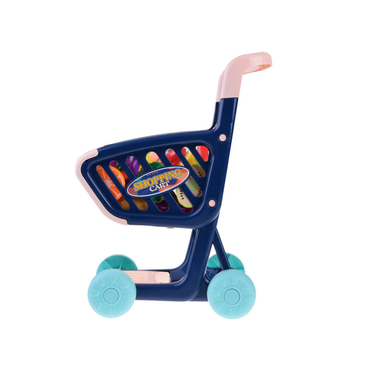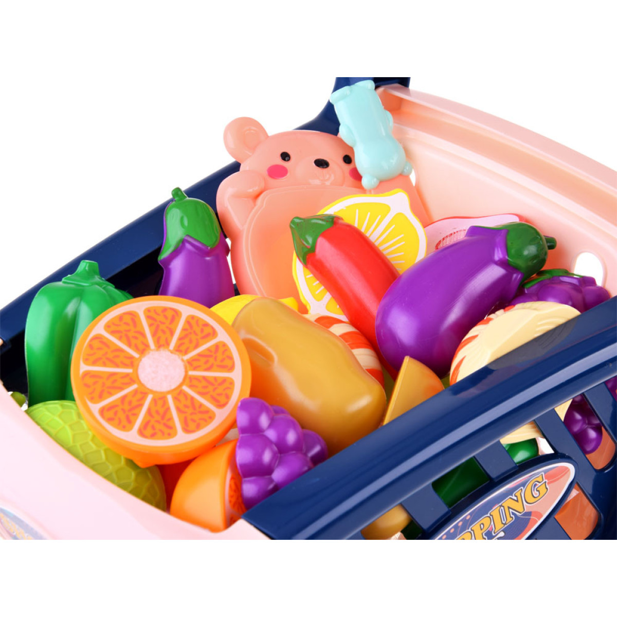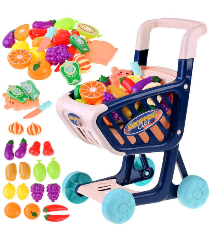 Rotaļlietu iepirkumu ratiņi ar dārzeņiem un augļiem