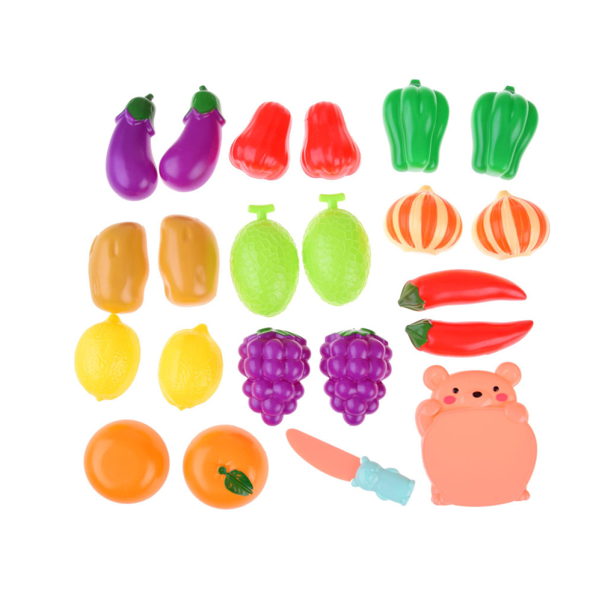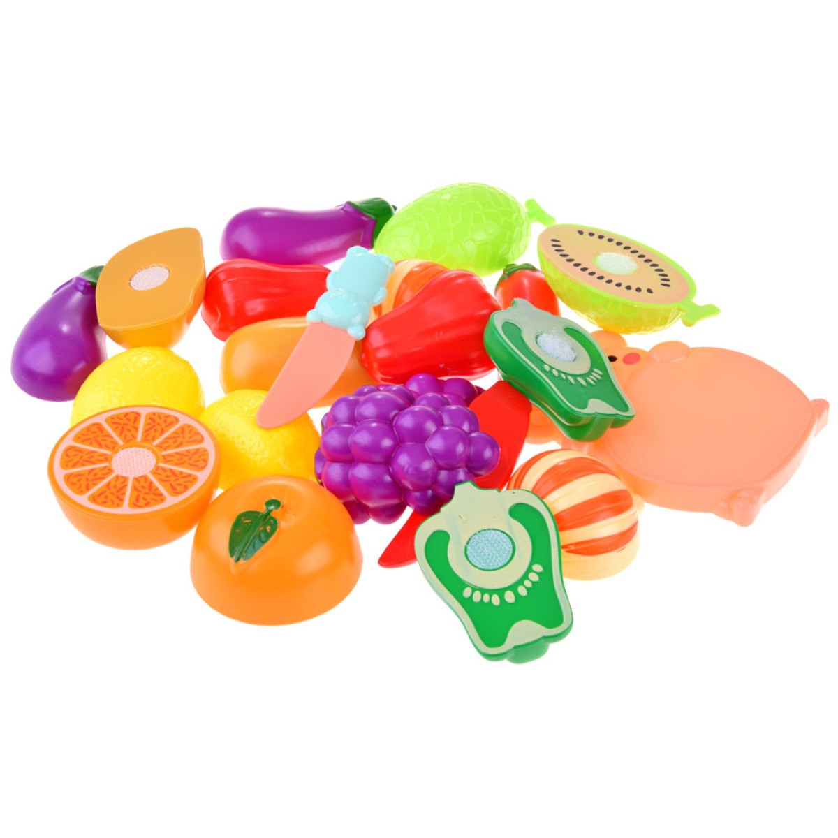 Dārzeņi un augļi ir plastmasas un pievilcīgās krāsās. Tie ir savienoti ar velcro, kas ļauj bērnam rotaļāties tos sagriežot.