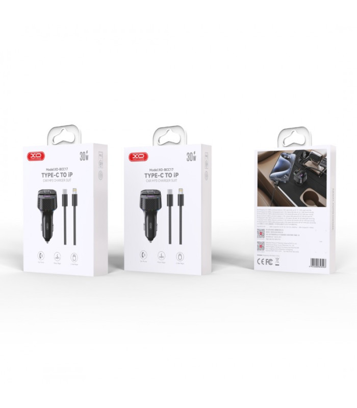 XO siųstuvas FM BCC17 -quot;Bluetooth-quot; MP3 automobilinis įkroviklis 30W juodas + USB-C kabelis - USB-C