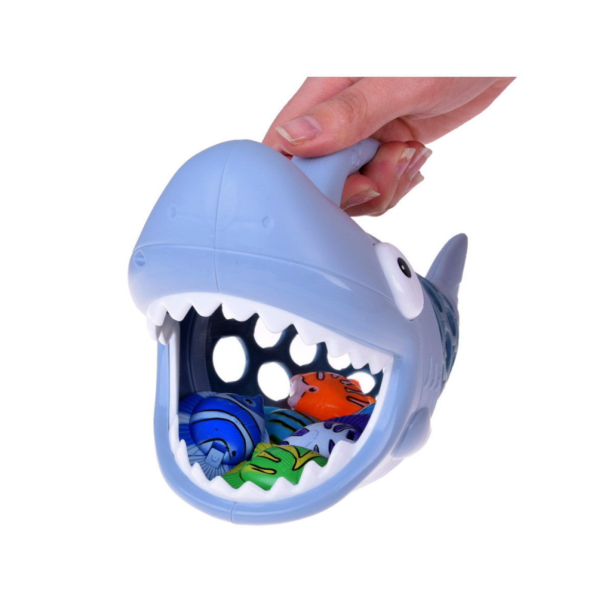 tas nav tikai parasts vannas rotaļlietu komplekts. haizivs formas groziņš padara zivtiņu ķeršanu vēl interesantāku un iesaista bērnu aktīvā spēlē.