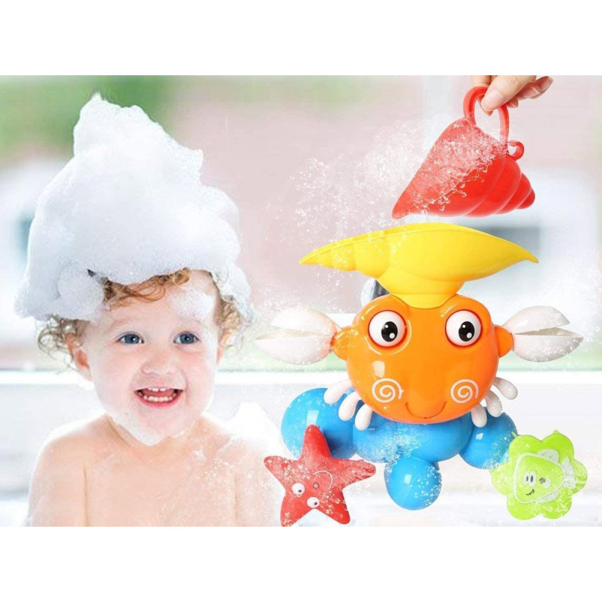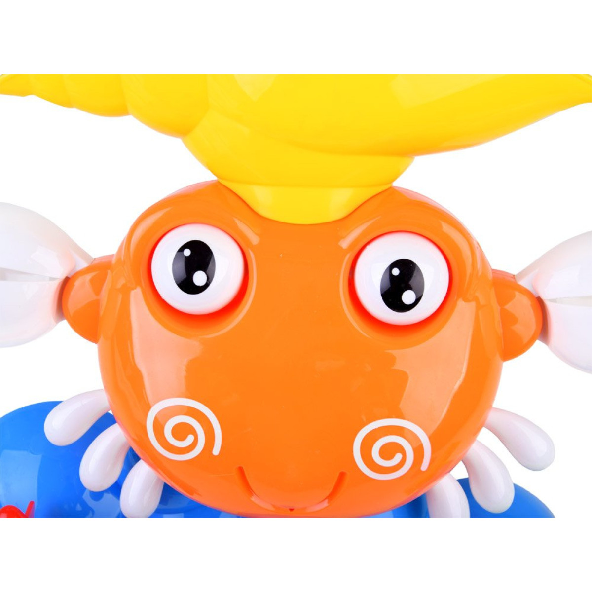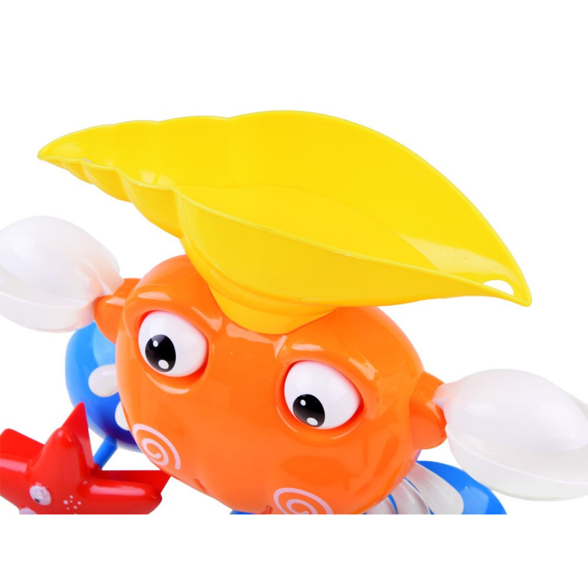 - Krabim ir īpašs konteiners, ar kuru var liet ūdeni čaulā uz galvas, un bērns atklās pārsteigumus, piemēram, kustīgās spīles, acis, jūras zvaigzni un ziedu ar zivtiņu. No krabja mutes veidojas maza strūklaka.