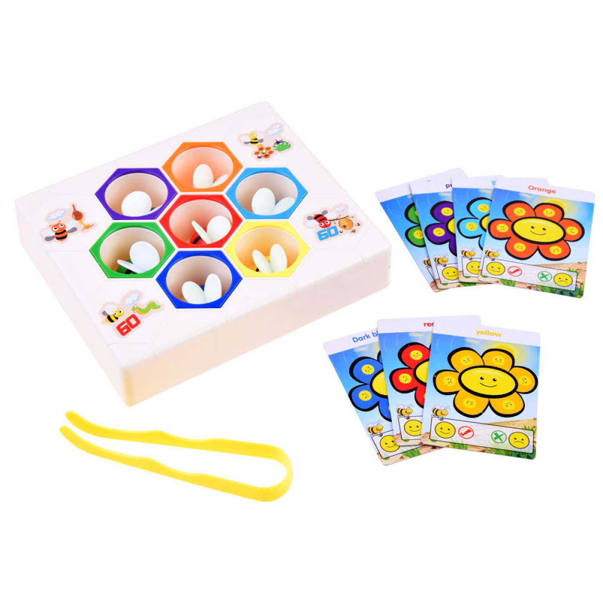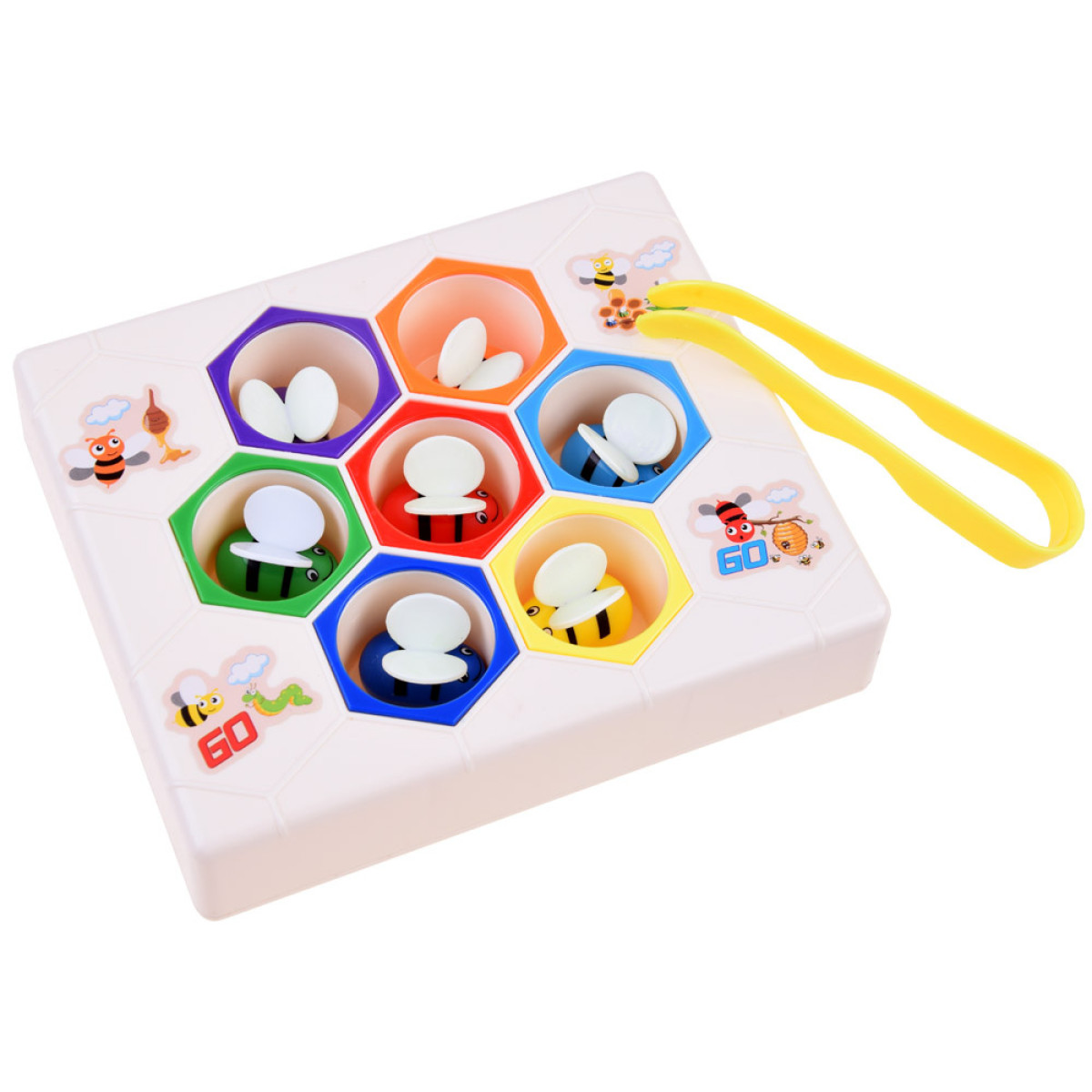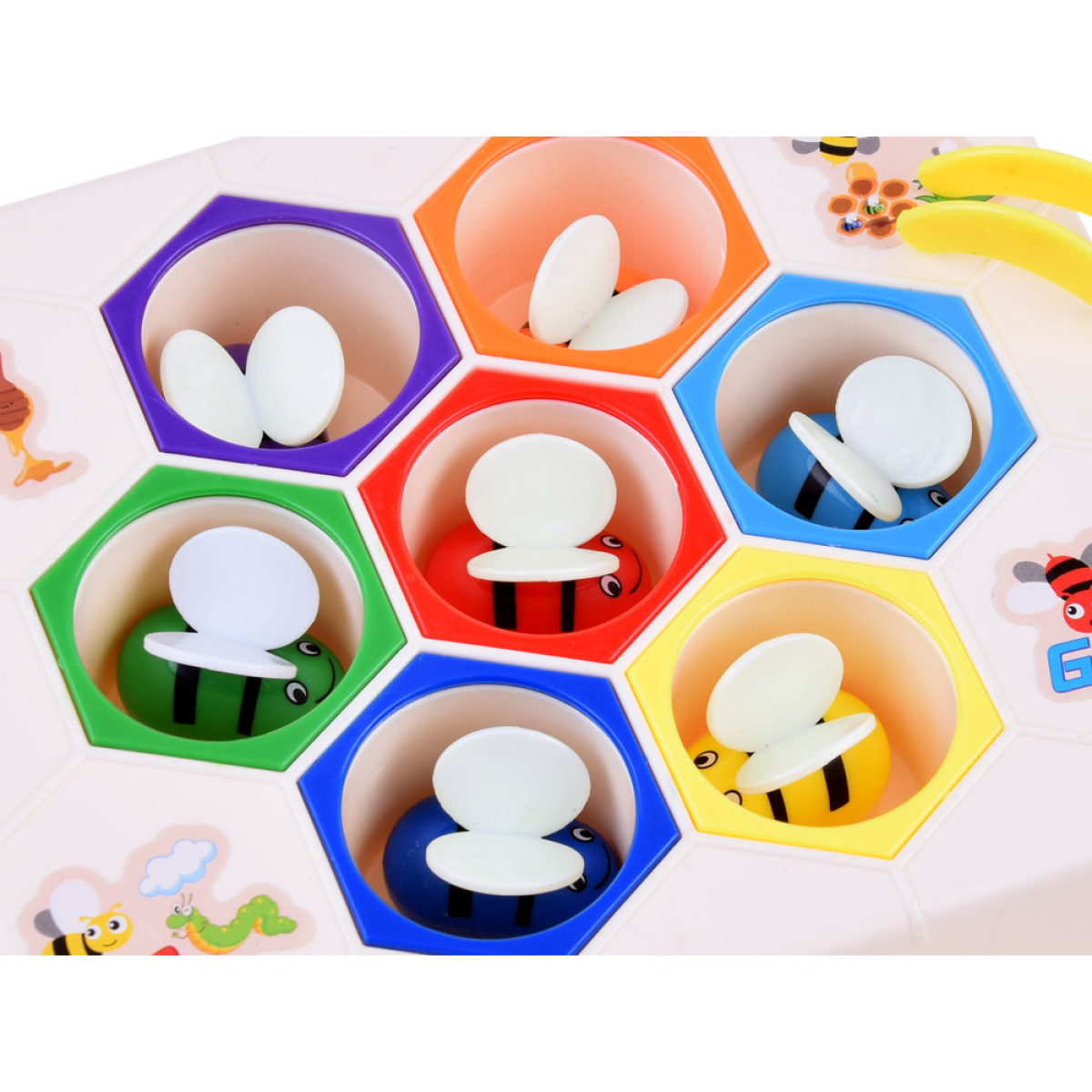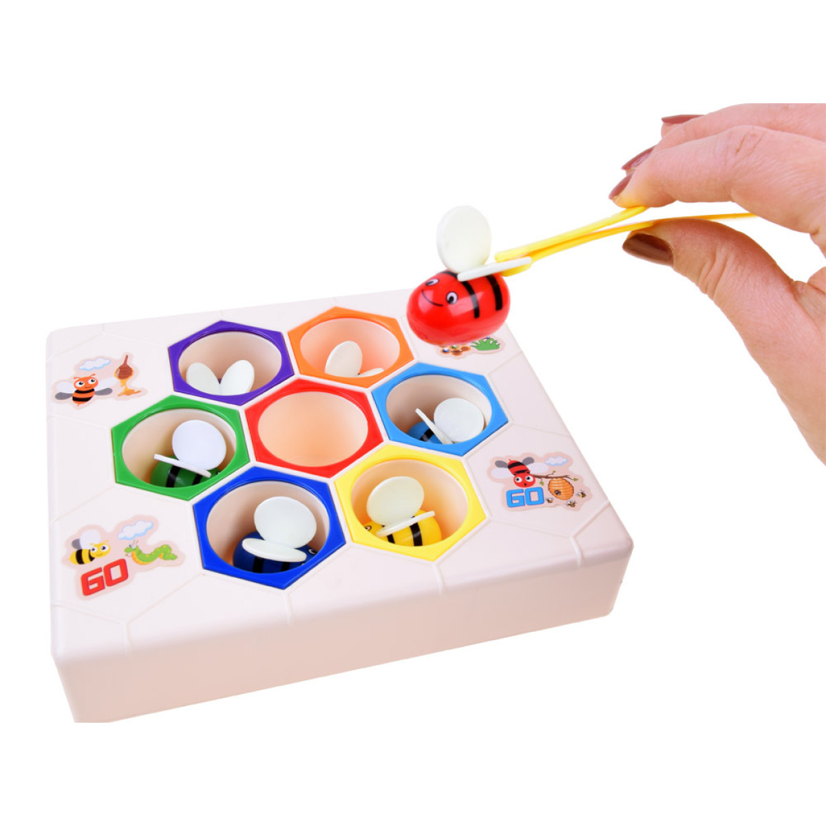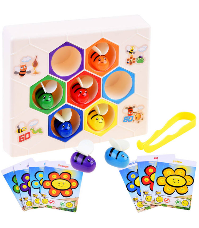 Izglītojoša rotaļlieta darbīgās bites uz medus šūnām ir piemērota bērniem no 3 gadu vecuma. Rotaļlieta izgatavota no izturīga plastmasas materiāla. Komplektā ietilpst 7 krāsainas bites. Rotaļlietu var izmantot divos veidos: