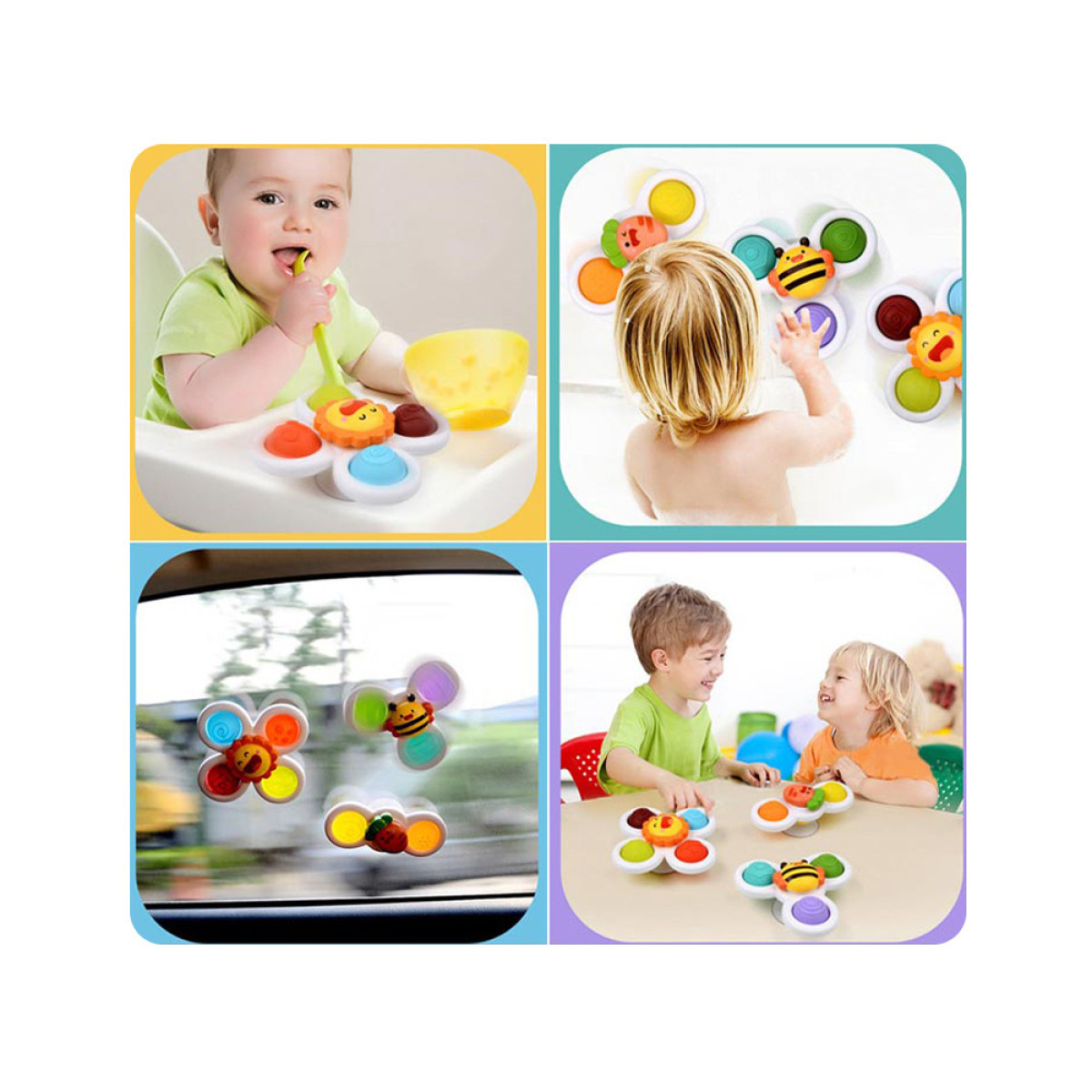Krāsaini fidget spinneri ar piesūcekņiem ir lieliska izvēle ikdienas rotaļām mājās, vannā un ceļā. Tos var viegli piestiprināt pie galda virsmas ēšanas laikā, pie automašīnas loga brauciena laikā vai pie citas gludas virsmas. Šim komplektam ir daudz pielietojumu – atliek tikai iedot rotaļlietu bērna rokās.