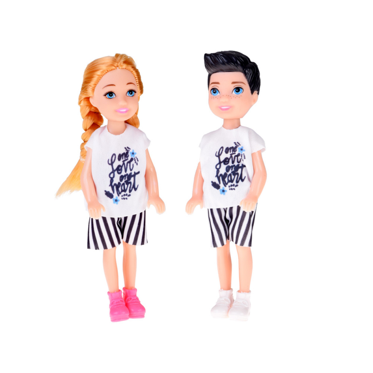 - meitenes figūriņa ar gariem blondiem matiem bizēs, zilām acīm, baltu krekliņu ar melnu apdruku, melnbalti svītrainiem šortiem un rozā kedām. Izmērs: 14 x 3,5 cm.